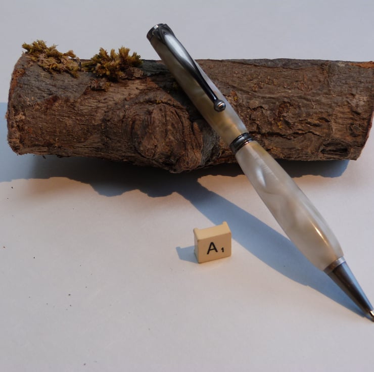 This is a hand crafted and turned pen using an acrylic, the operation is a simple twist to reveal the ball point. It’s finished with an high gloss that will last and requires no maintenance to keep the shine. I supply the pen in a handcrafted wooden presentation box where I can add a simple greeting (FOC) to the lid using pyrography, just add your message when ordering