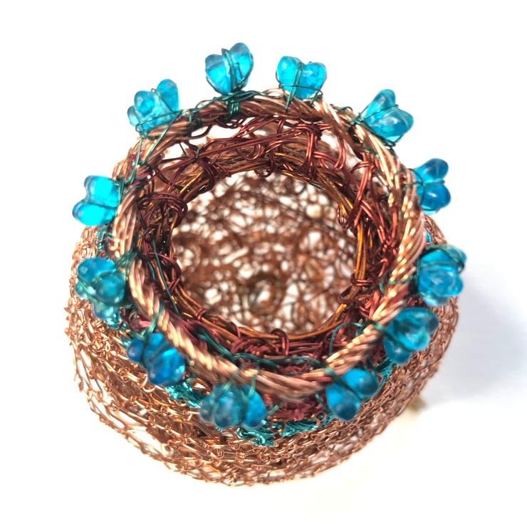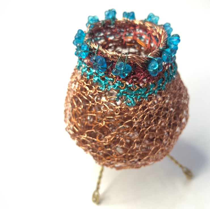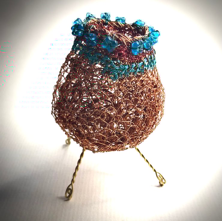 Knotted and stitched double skinned tottie pot made from recycled materials - wire reclaimed from televisions, vintage retro plastic turquoise beads, wire Prosecco bottle cage, bought wire (turquoise). Each tottie pot is made with no plan and evolves as I construct and as the raw materials present themselves and this was completed over a number of years - today I combined the beads that I have for years from an old necklace. Each piece is made by hand and many hours going into their creation.