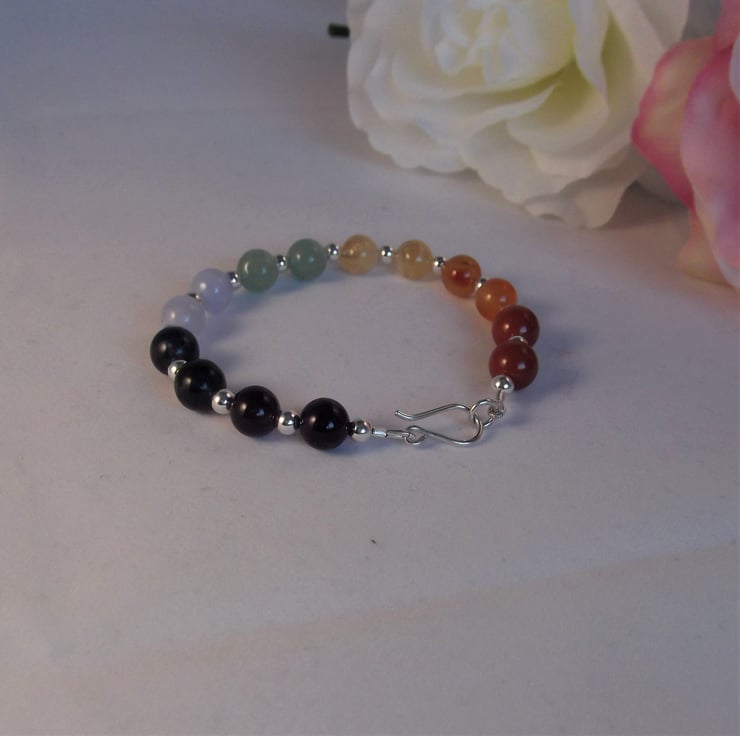 This rainbow bracelet consists of pairs of crystal beads in red, orange, yellow, green/ pink, blue, indigo and purple.