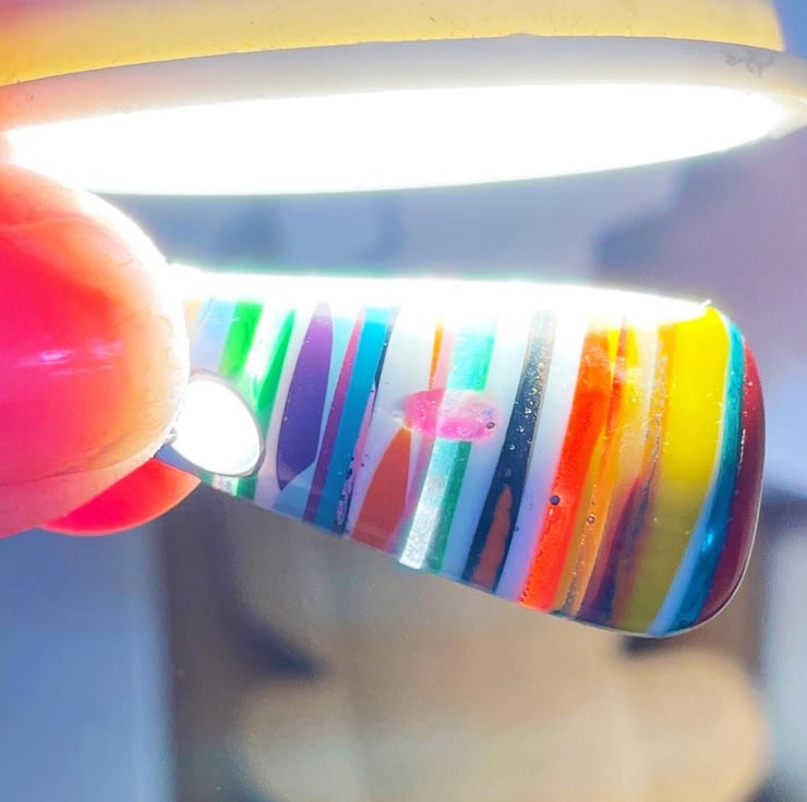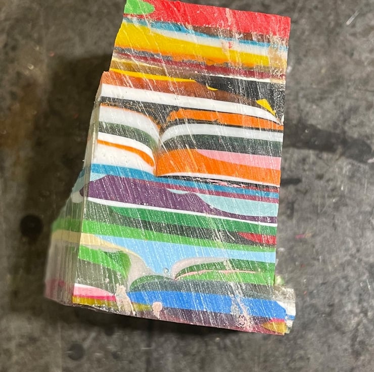 I pour the excess resin into a jar and over time (about a year) this build up into a block, I then cut the block up to create unique and totally individual layers that are then craved into jewellery.