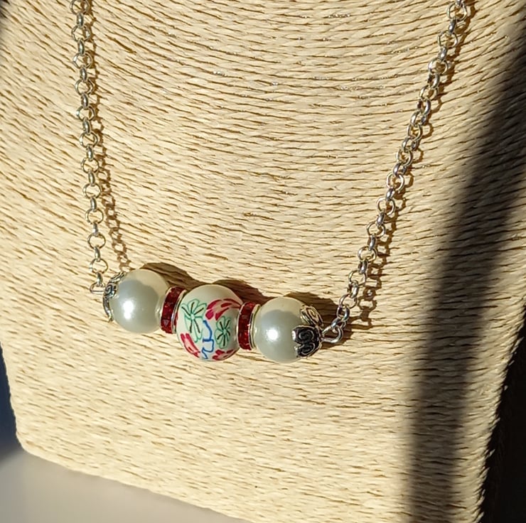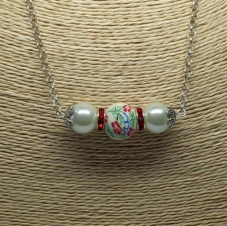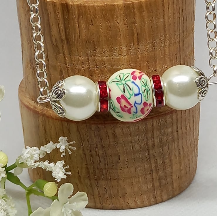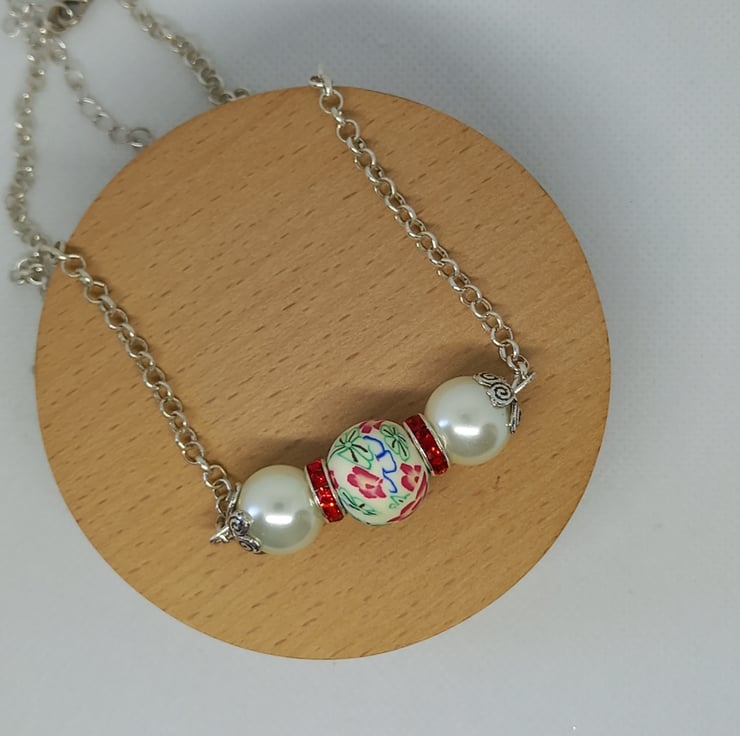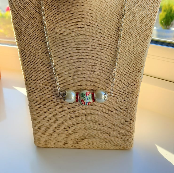 A very pretty necklace with a large 17mm central polymer clay bead in an oriental design, flanked by red diamante spacers and 14mm cream glass pearls. Extra decoration comes in the form of bead caps and all the beads are threaded onto sturdy silver plated copper wire. Silver plated rolo chain, a lobster clasp and extension chain complete the look.