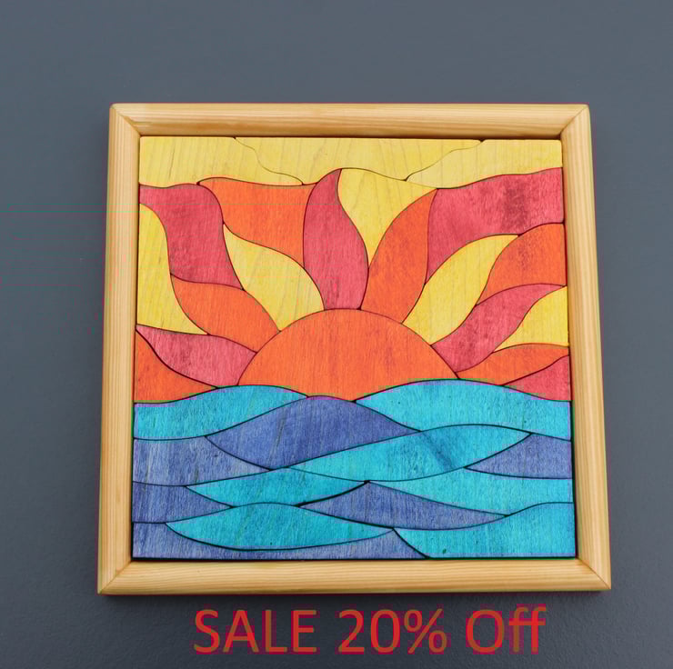 Colourful wood puzzle designed in 'sunset at sea' pattern, an ideal gift for anybody who spends time at there desk. The puzzle can either be laid flat or mounted vertically in the supplied holder as an ornament. The frame edging is made from pine with plywood backing.The puzzle itself is made from 10mm thick maple, stained in bright colours, and coated in a hardwearing lacquer providing a satin finish.