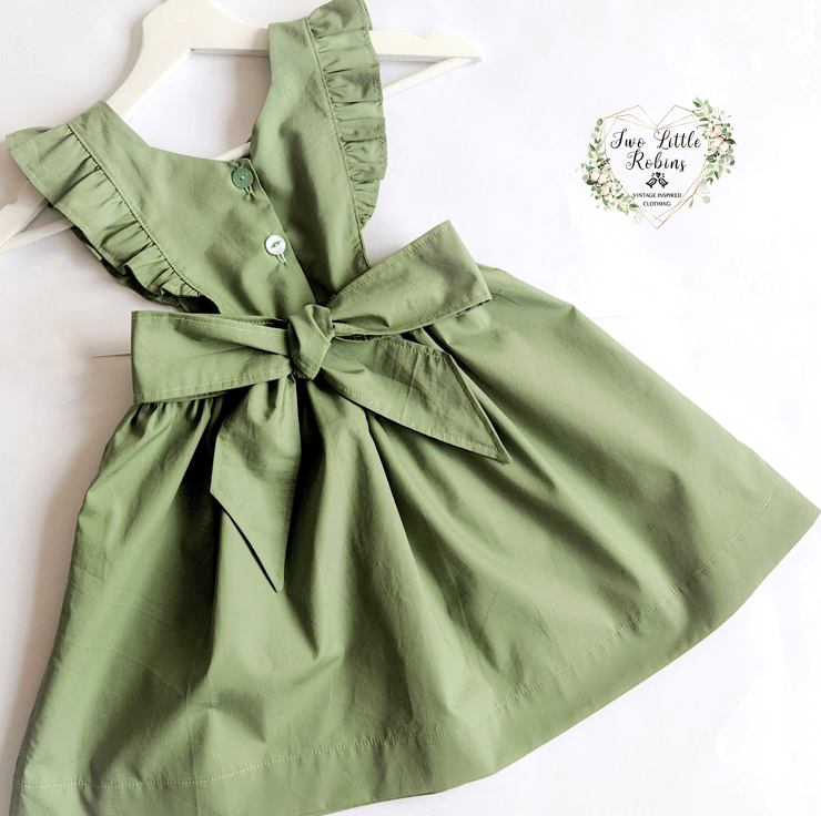 The Astoria Pinafore features a beautiful V neck front and back bodice, which closes with buttons, there are flutter sleeves which extend down the front and back of the bodice to the waistband. A statement bow on the rear waistband completes the look.