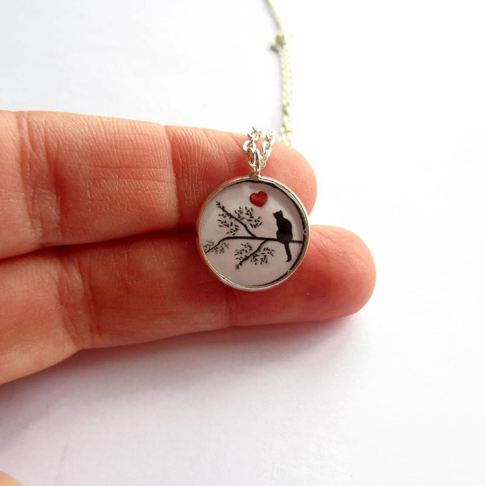 This pretty pendant necklace features a sweet silhouetted picture of a little black cat sitting on a branch with a tiny red love heart.
