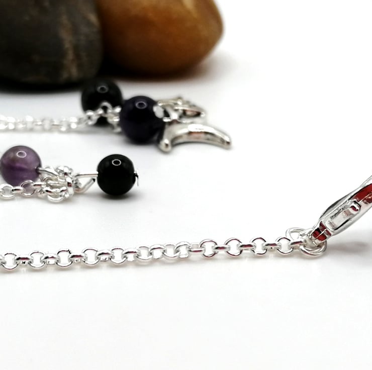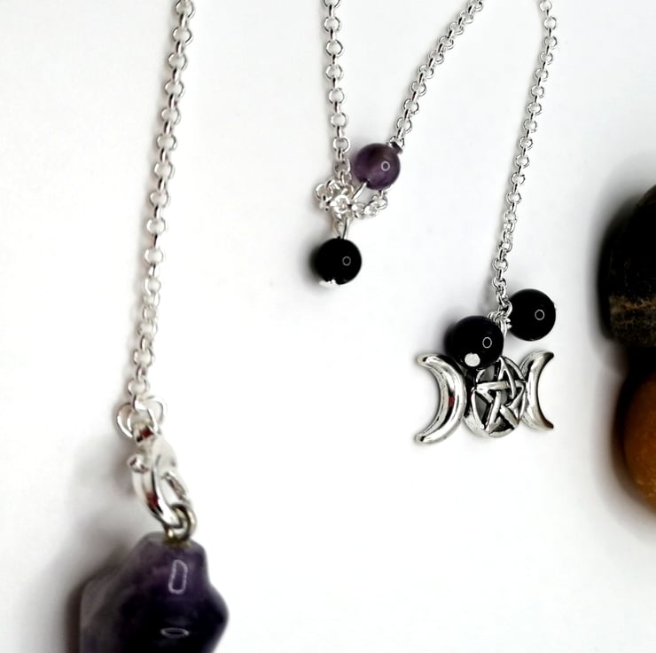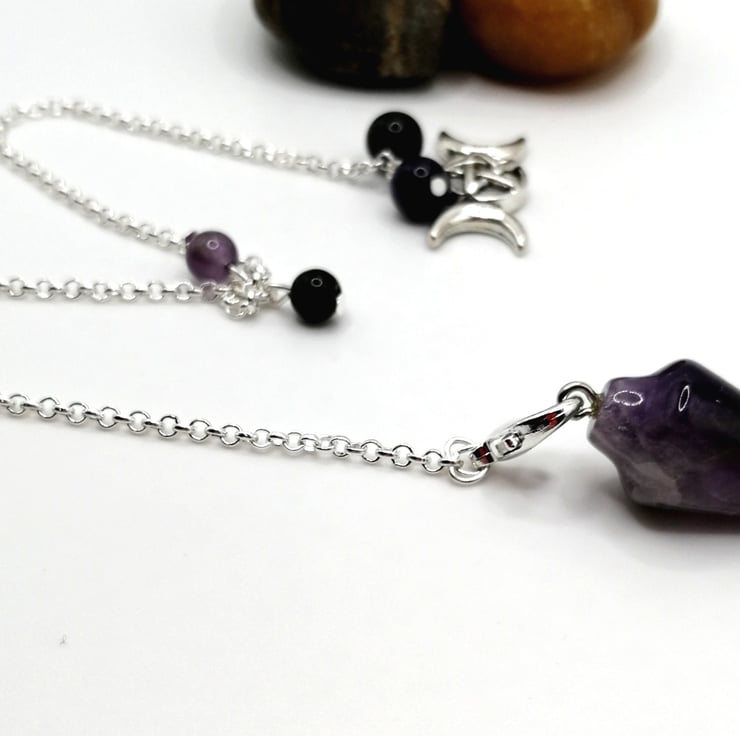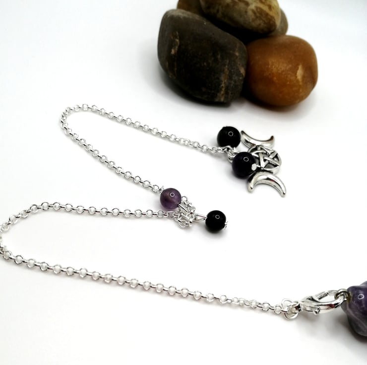 This pendulum is made from amethyst. The beads are obsidian and amethyst. The chain measures 12 inches. The smaller beads mark the halfway point of the chain which is a good place to hold when using.