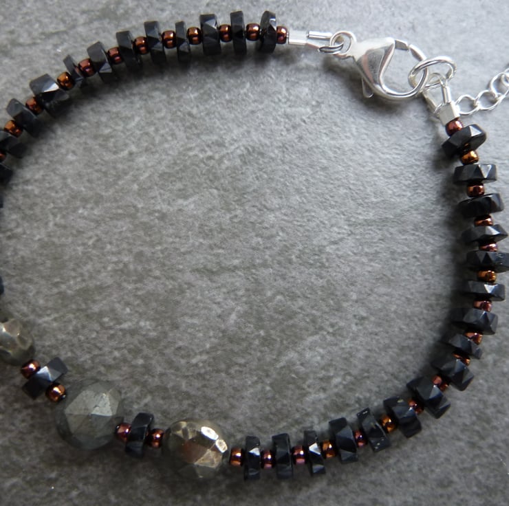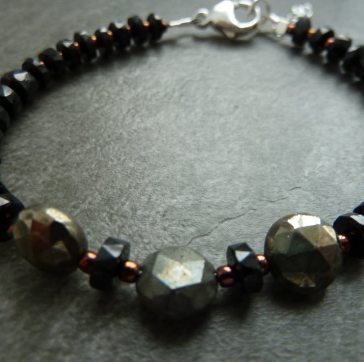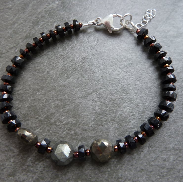 A bracelet made with grade AA black spinel gemstone beads and pyrite beads.