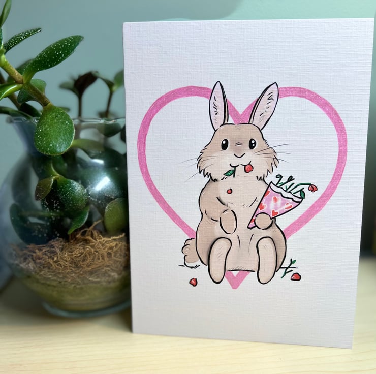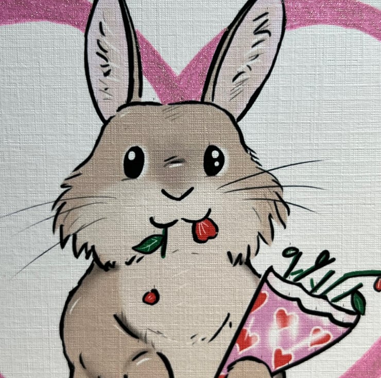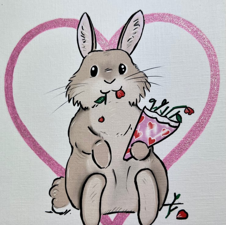 We all know our bunnies would eat Valentines’ day flowers if they had the chance, and this bunny is no exception. This card has been hand finished with a shimmering effect on the heart