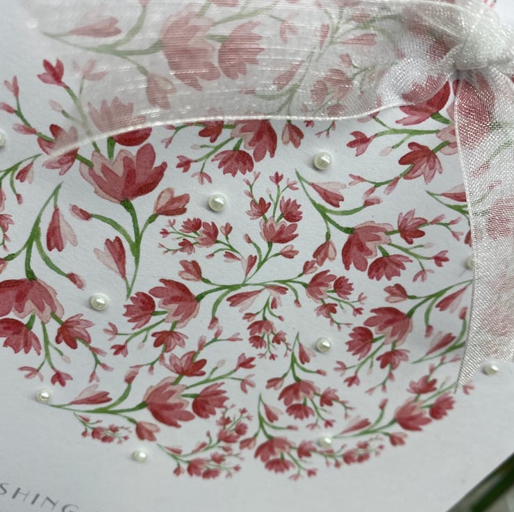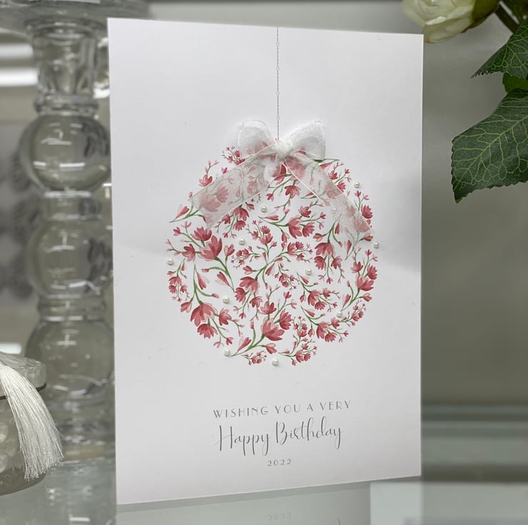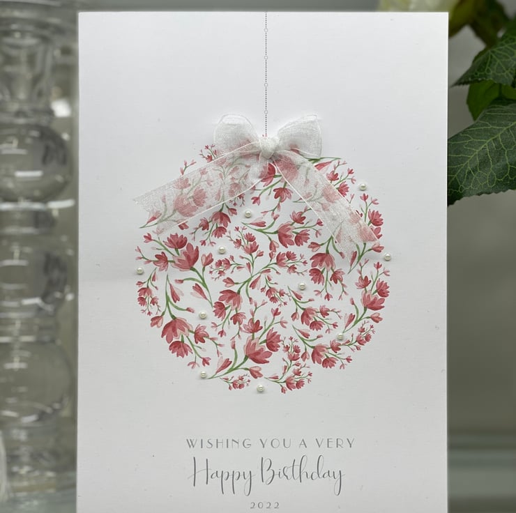 A beautiful birthday card, decorated with ribbon and gems, and printed on 300gsm thick card