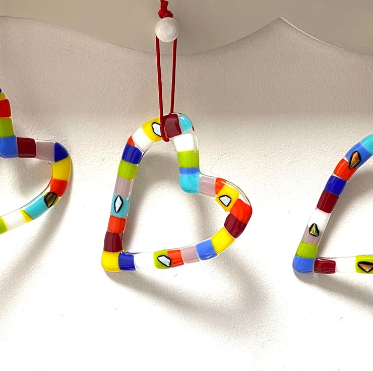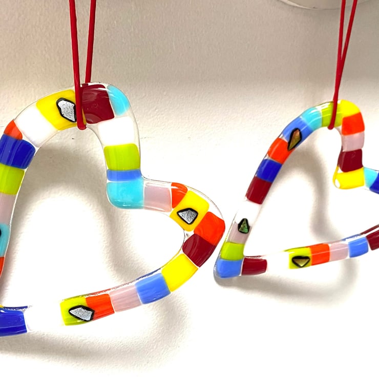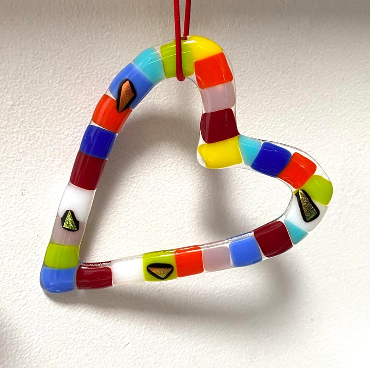 Fused Glass Patchwork of bright colours, open heart hanger with a few bits of shiny Dichroic glass to decorate.