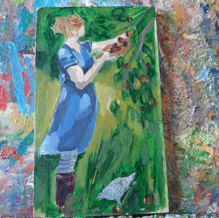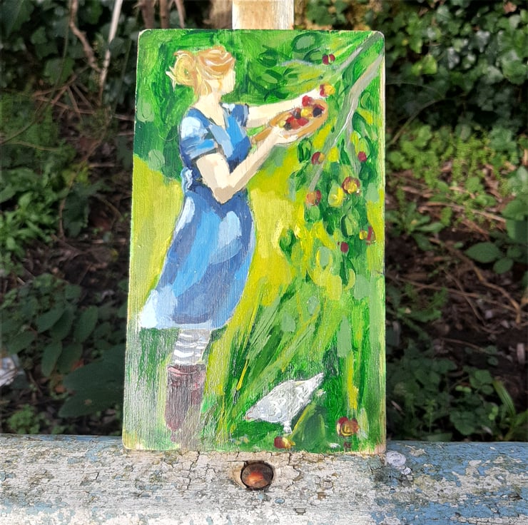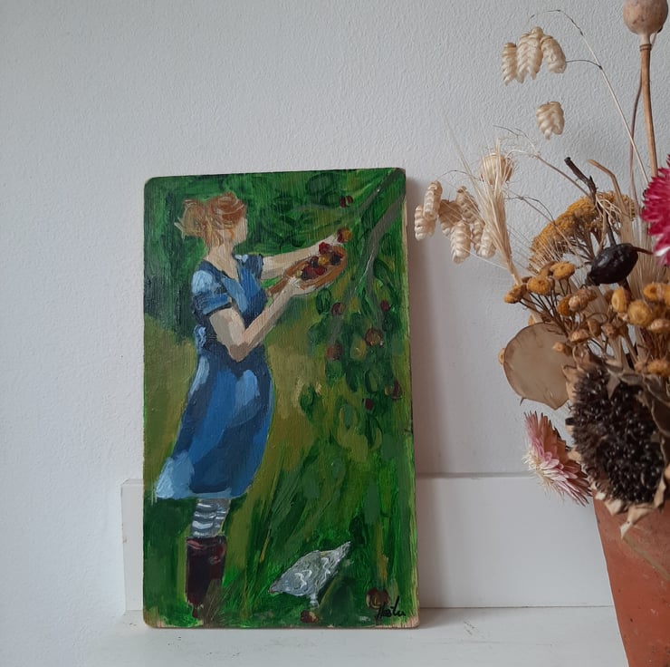 A sweet painting of a women gathering fruit with a chicken at her feet. I paint on reclaimed wood this one is on plywood that I sand and lightly Matt varnish. Ready to hang as a little hook on the back . 20 cm tall 12 cm.wide . Arrives in flat box in tissue.