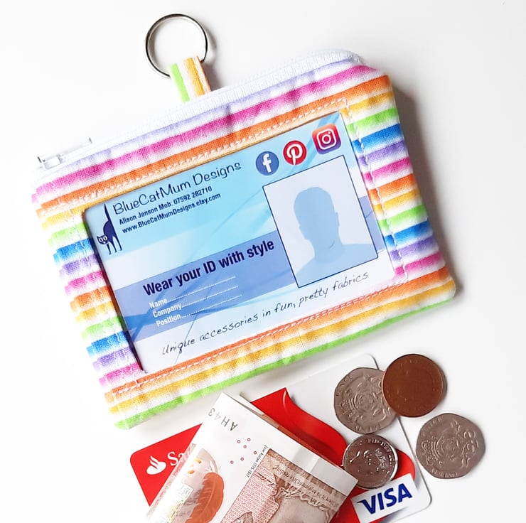 An ID holder and purse combined. Slide your ID into the front window, and then pop whatever you want in the zip pocket. Use the split key ring to attach onto a lanyard.
