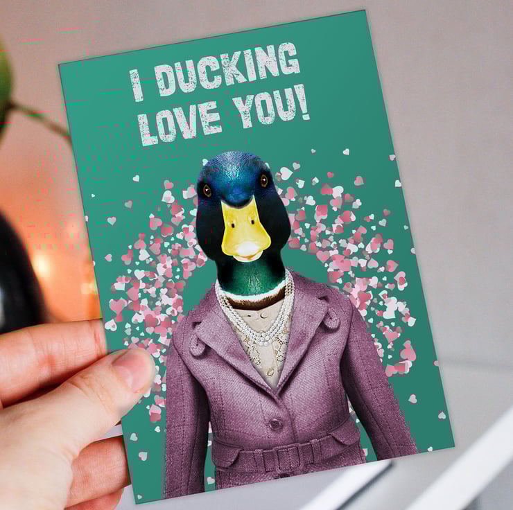 Duck in clothes Valentine's Day, love card - I ducking love you (Animalyser)