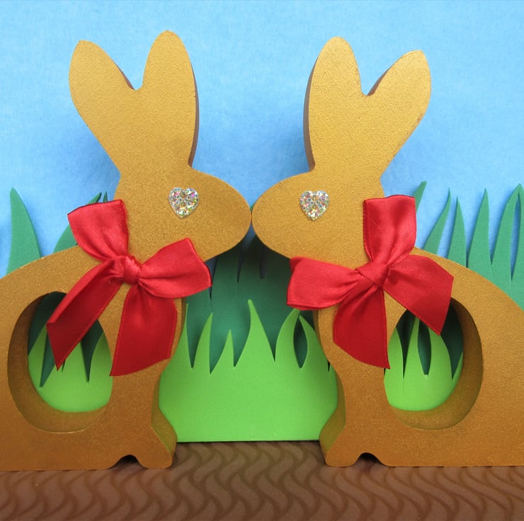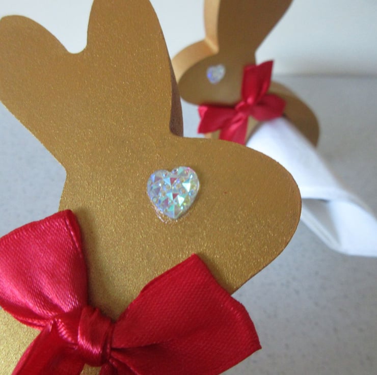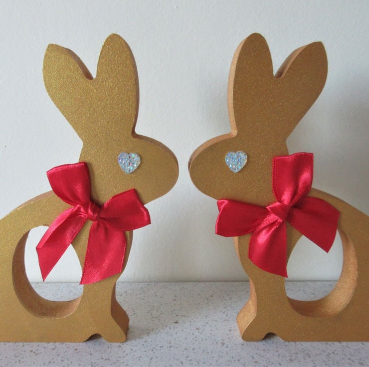 The bunnies are gold, with sparkly resin eyes, and red bows at their necks (each one is decorated on one side and plain on the other, and made so that they can be sat facing each other).