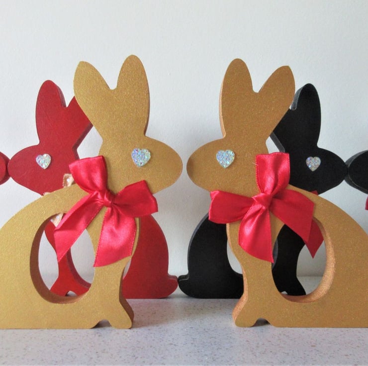 This is a pair of freestanding MDF bunnies. They are made as a pair to use as napkin holders for a romantic Valentines Day meal.