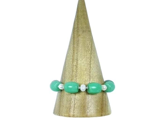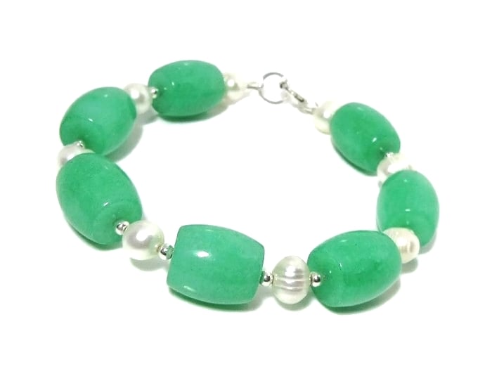 For this chunky handmade, statement bracelet I chose Aventurine barrel shaped 14mm x 8mm semi precious gemstones in a lovely bright green shade. I've alternated them with 7mm - 8mm white Freshwater Pearls.