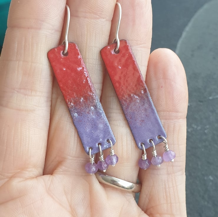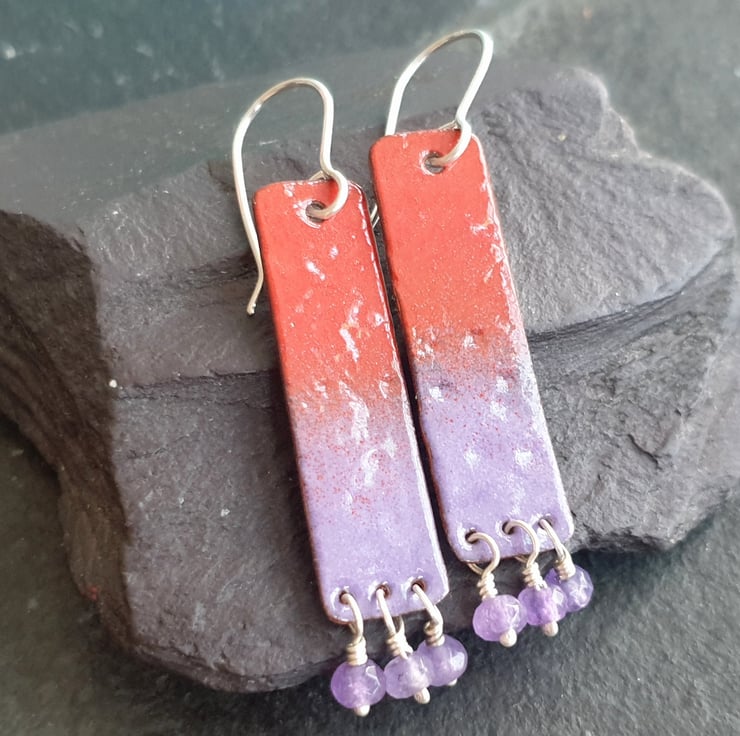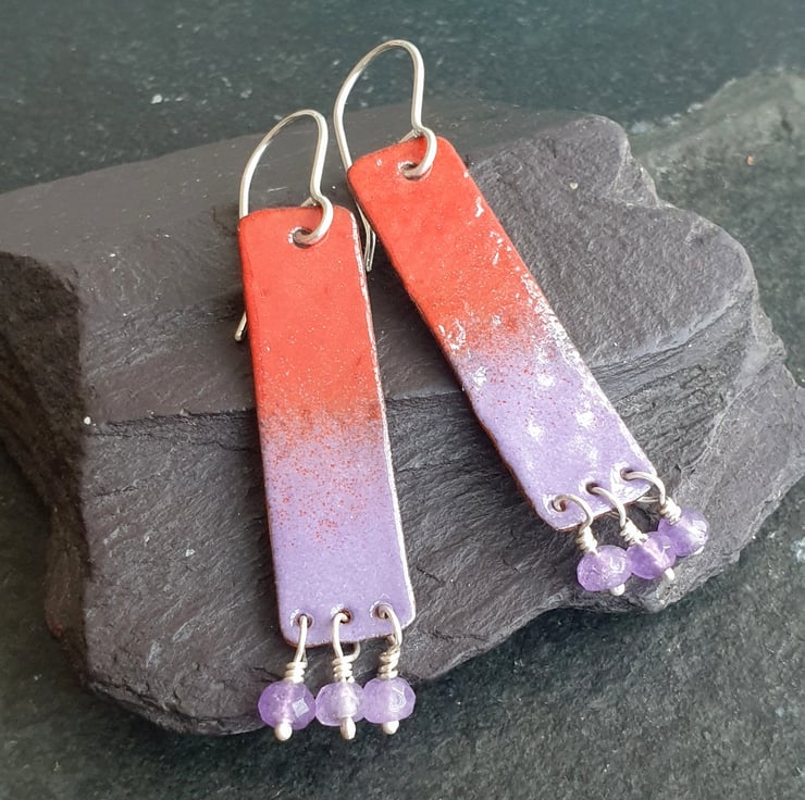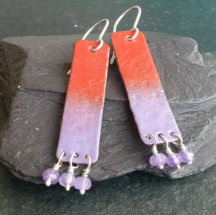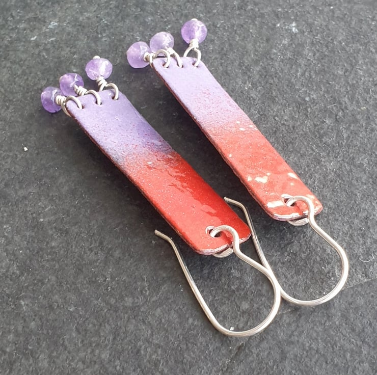 These lilac and red enamel earrings have been handmade from rectangles of copper sheet, which I've enamelled in a striking mix of bright red and pale purple. They are enamelled in plain black on the backs and hang from sterling silver ear wires. I've added some little amethyst gemstone beads to the bottoms of the earrings, the pretty colour of these nicely echoes the lilac enamel and adds a lovely bit of movement to the earrings.