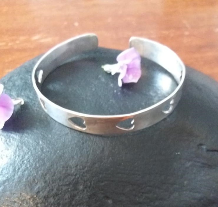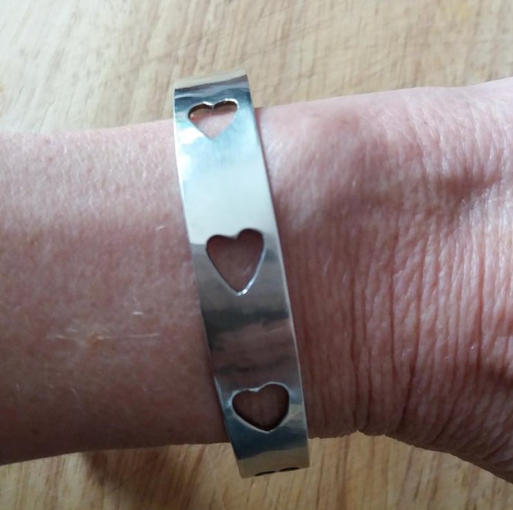 A handmade silver bangle in sterling silver, with 6 cut out hearts..