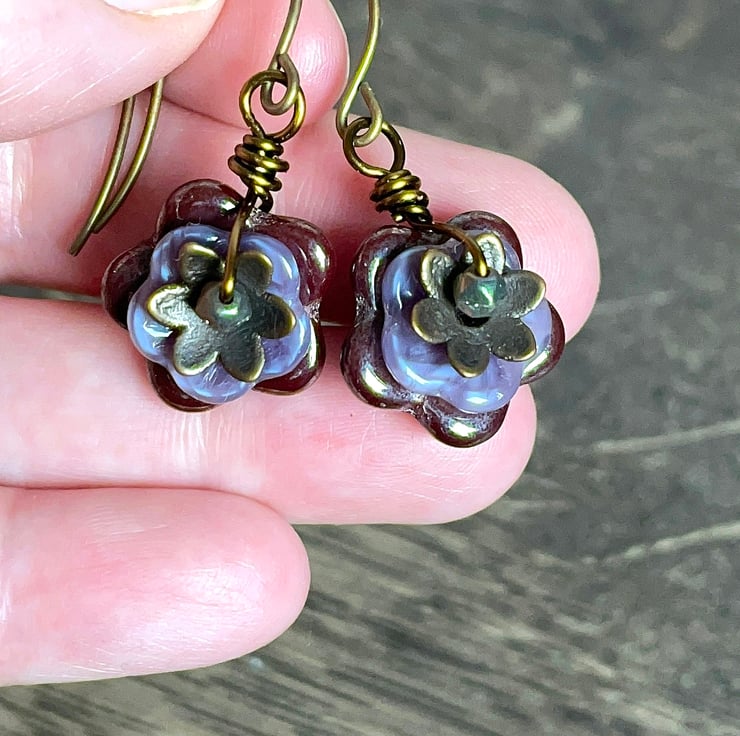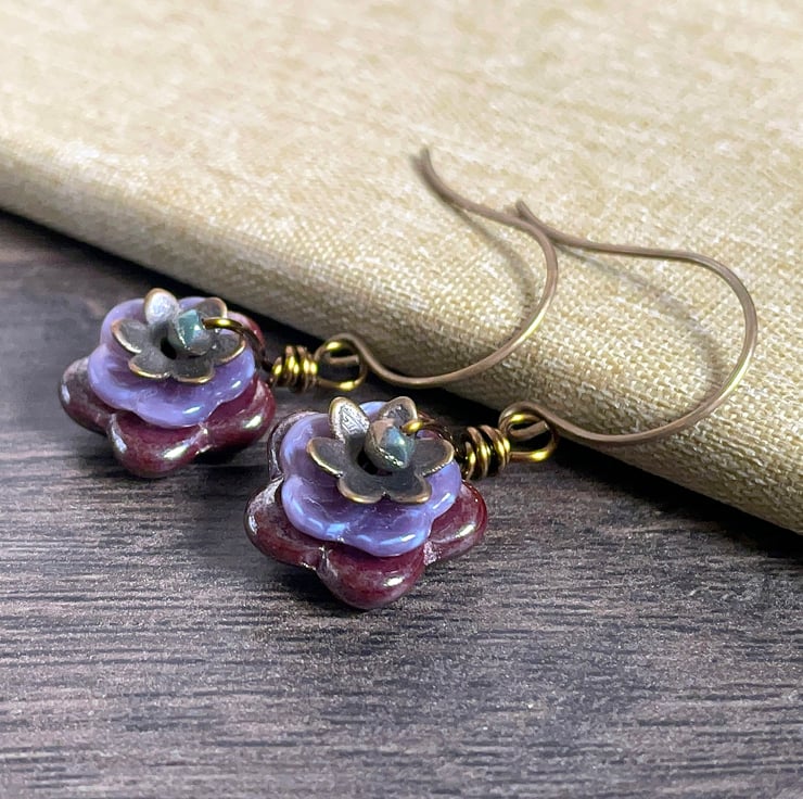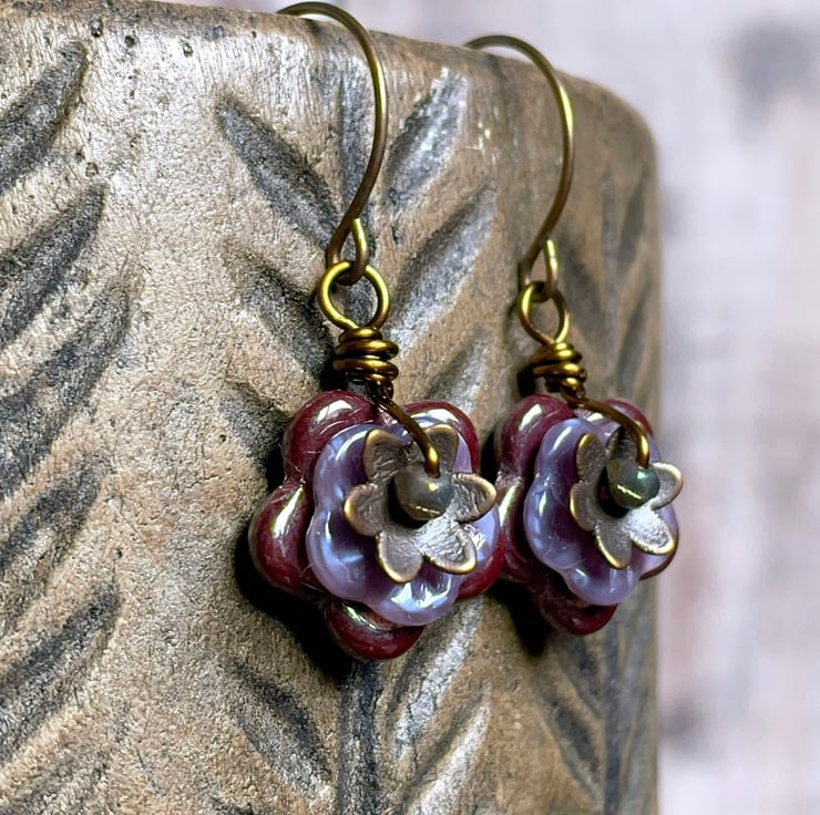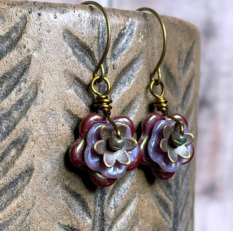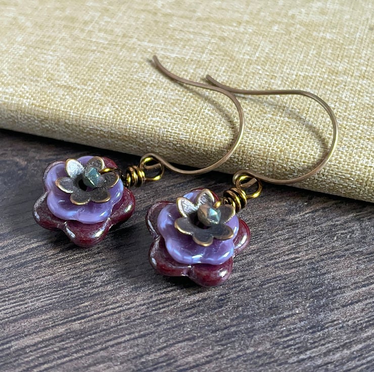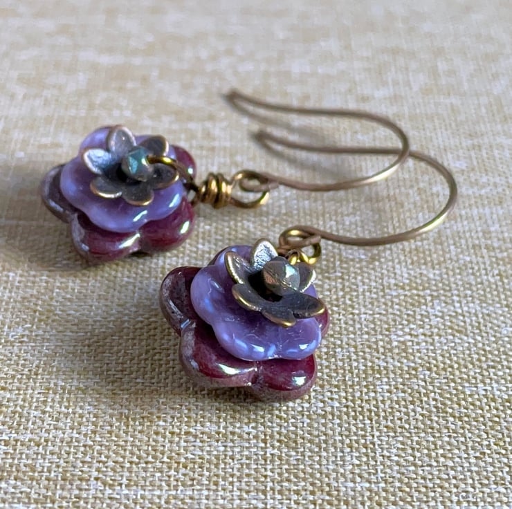 They feature Czech glass pinwheel flower beads in two sizes. The larger flowers are a warm shade of plum-red and the smaller ones are a delicate shade of lavender.