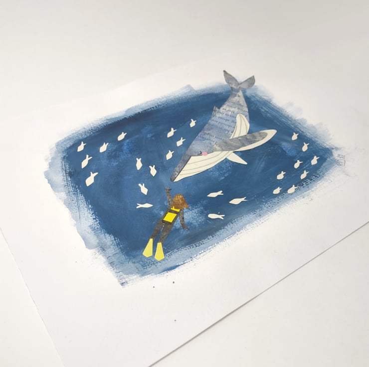 Made from hand painted collage paper, recycled paper and measuring 11 x 8