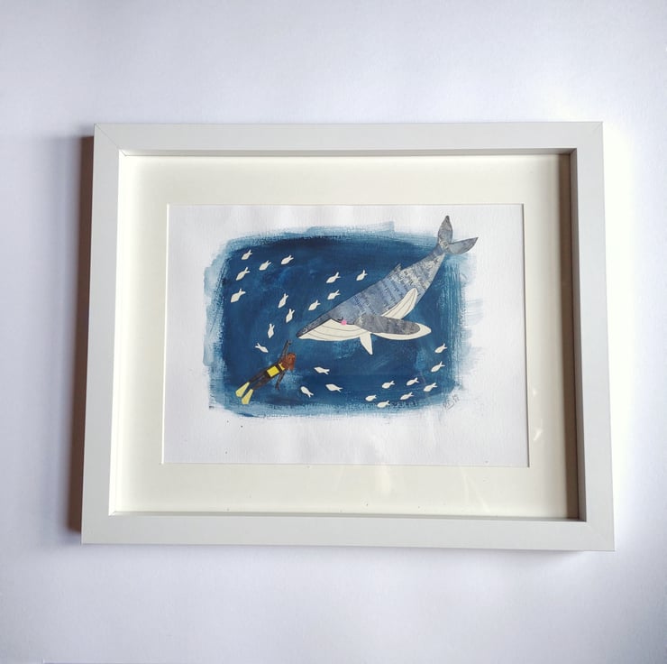 Framed seaside wall art featuring underwater collage of a humpback whale, fish and a diver.