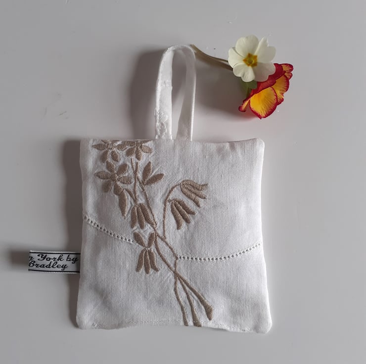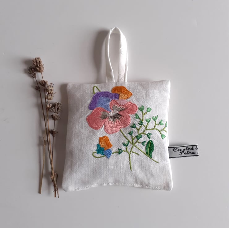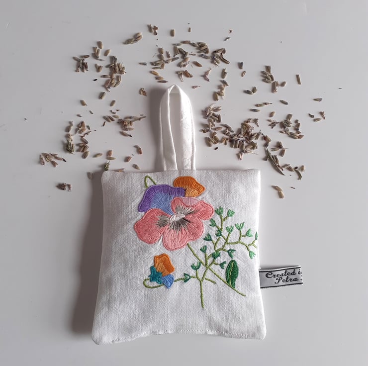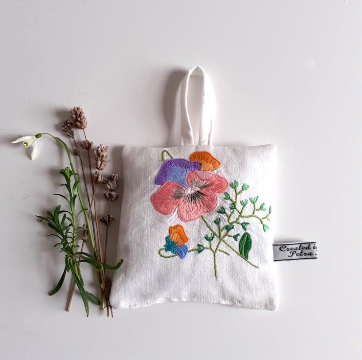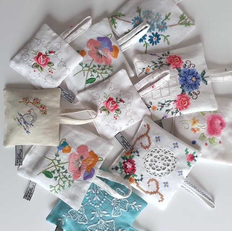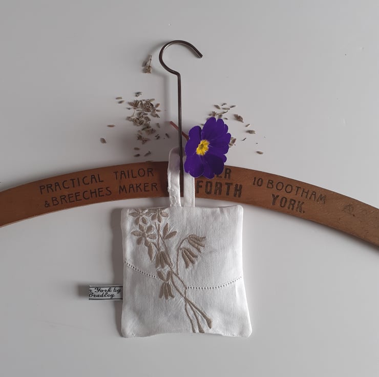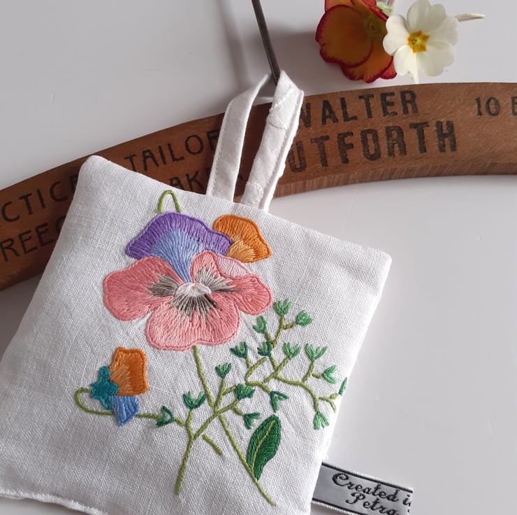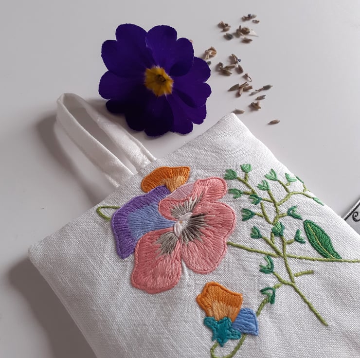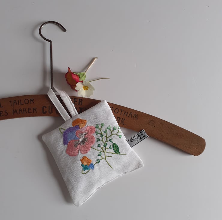 These small scraps of upcycled embroidered pansies have sewn up into pretty little lavender bags. The vintage floral embroidery has been beautifully worked by an anonymous gifted embroiderer, and is filled with a muslin bag of dried lavender from North Yorkshire. Lavender is the ancient cure for sleepless nights, for deterring pesky moths, and for keeping clothes fresh in storage.