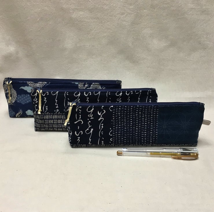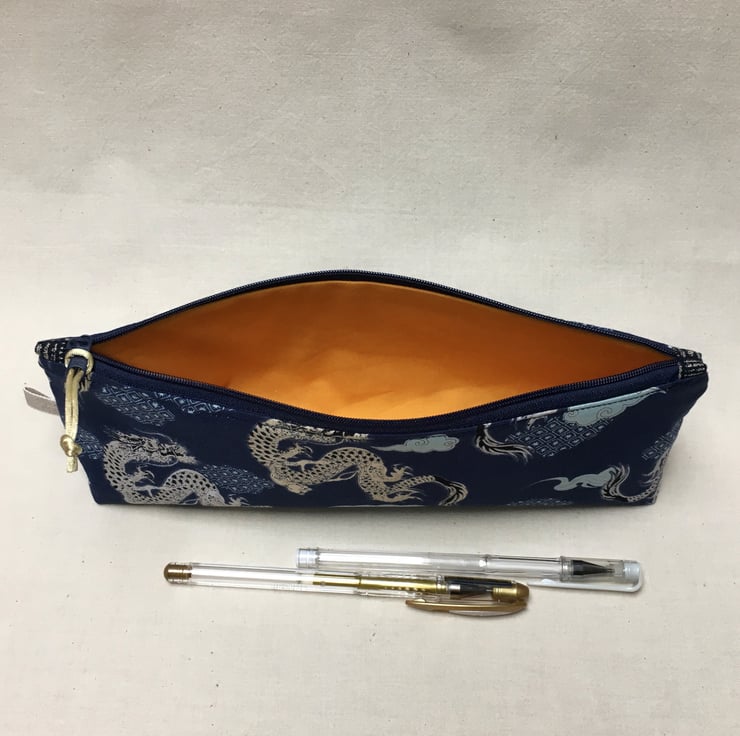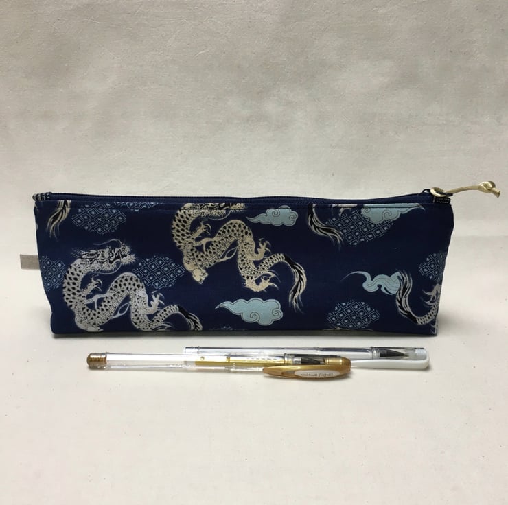 This pencil pouch or case has been created from Japanese cotton. Black and cream dragons are depicted on a dark blue background with light blue and patterned clouds.