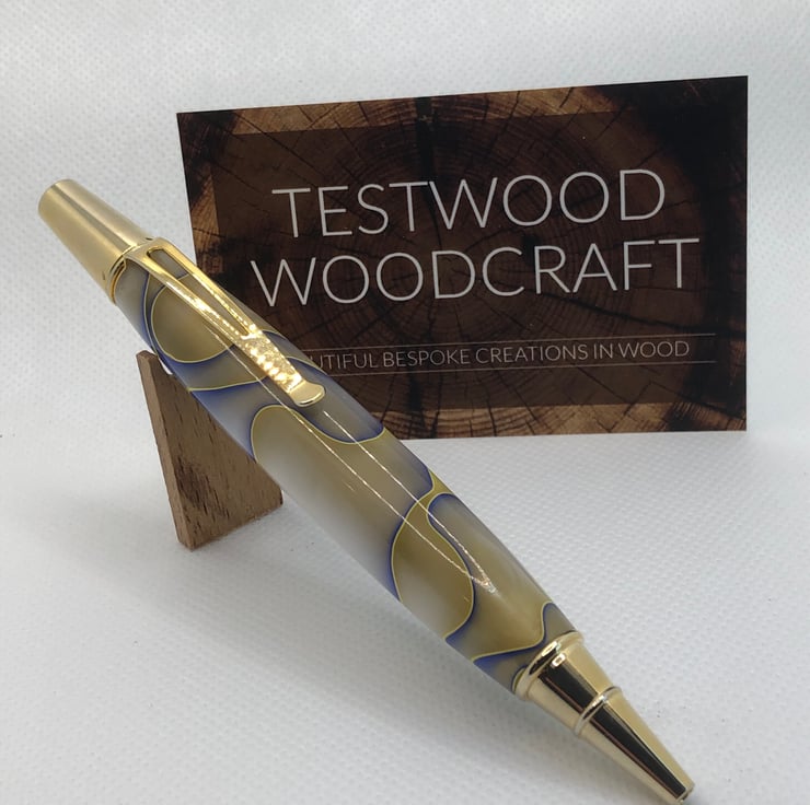 This pen was created using a multicolour acrylic which when turned reveals the colours and patterns within. Each is individual and this one has a single piece body. Operation is a simple twist to reveal the ballpoint, (these are easily changed ) The high polish finish requires no maintenance and the metal work is finished with a gold plating.