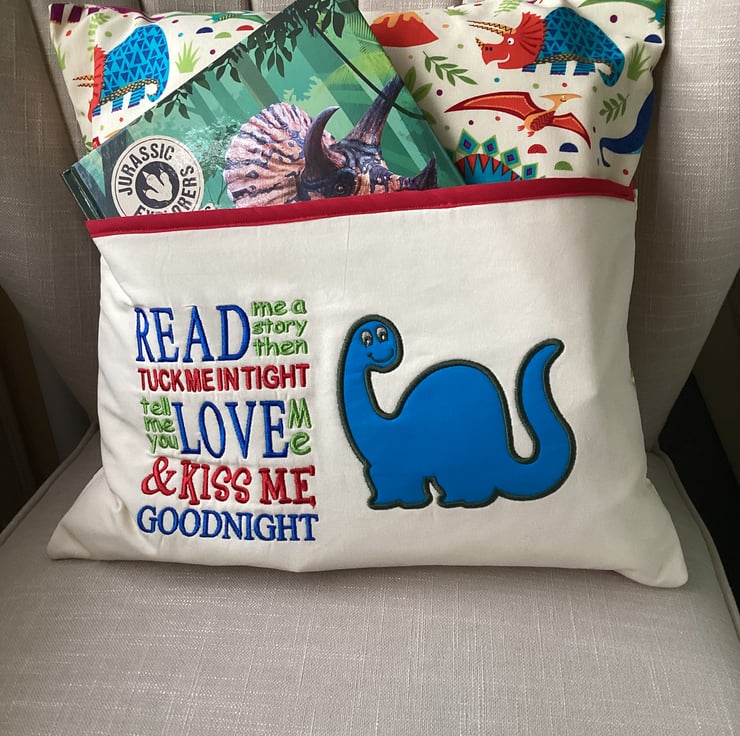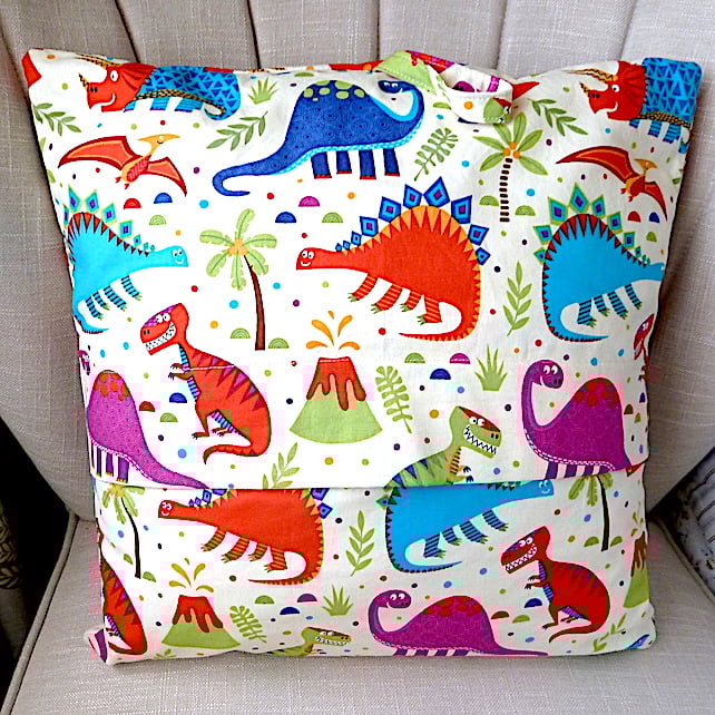 This book cushion is made from cotton fabric which has a colourful dinosaur design and appliqué motif.