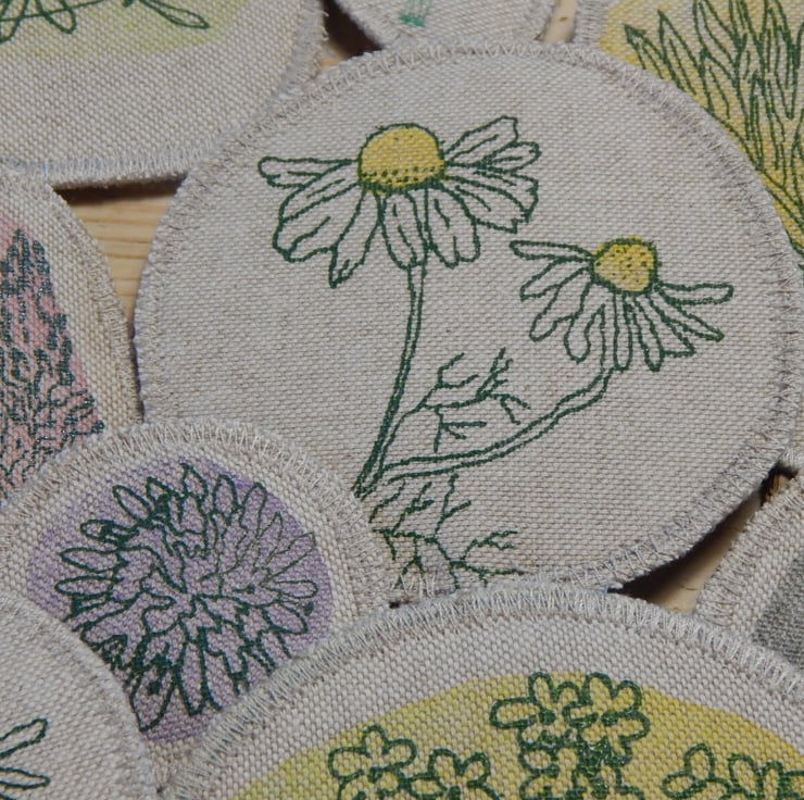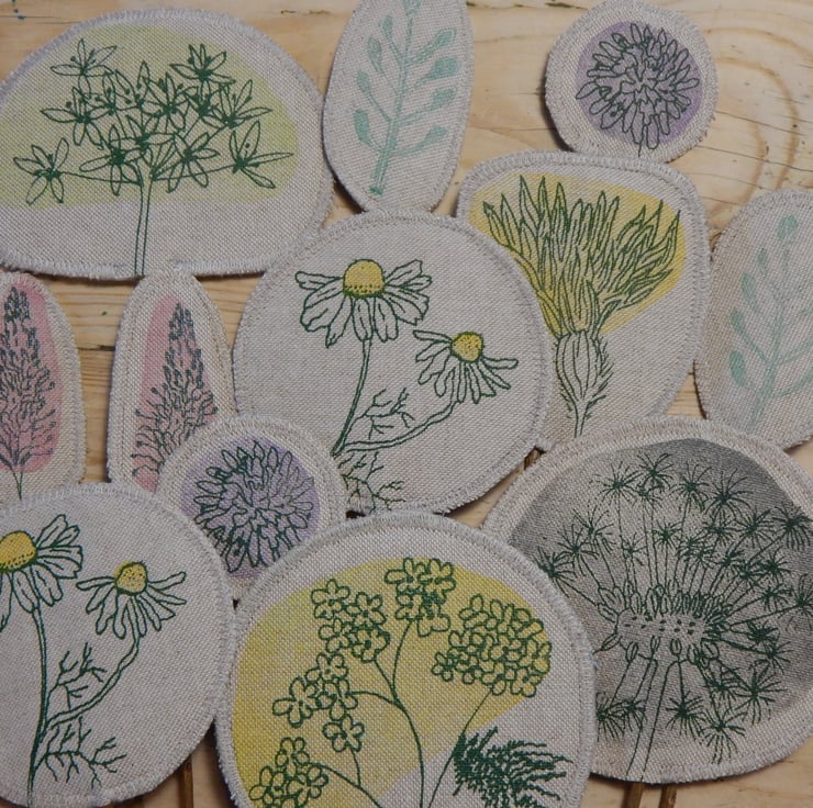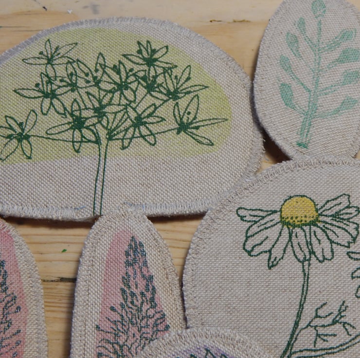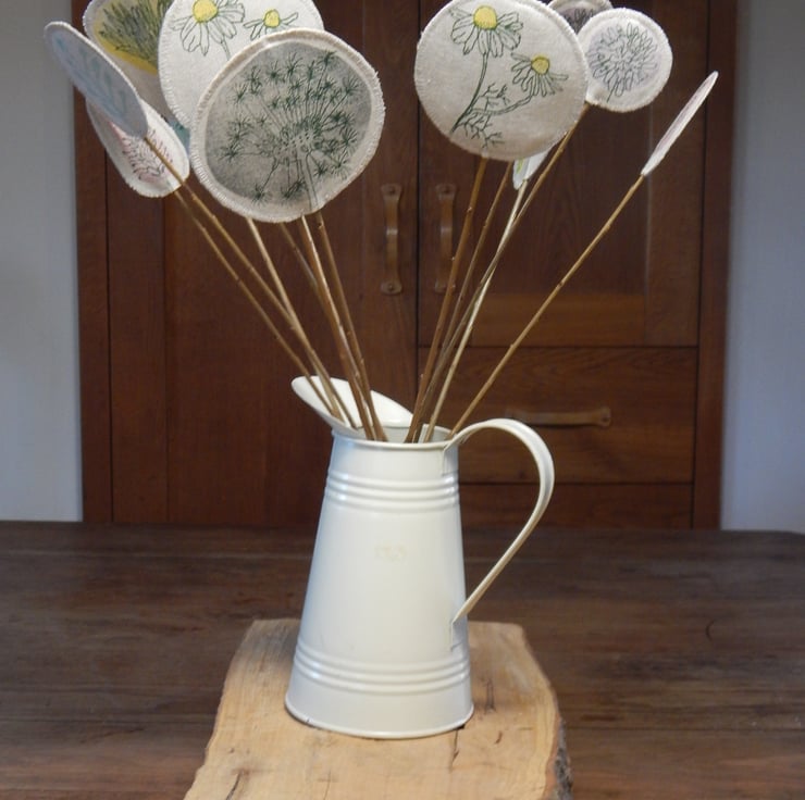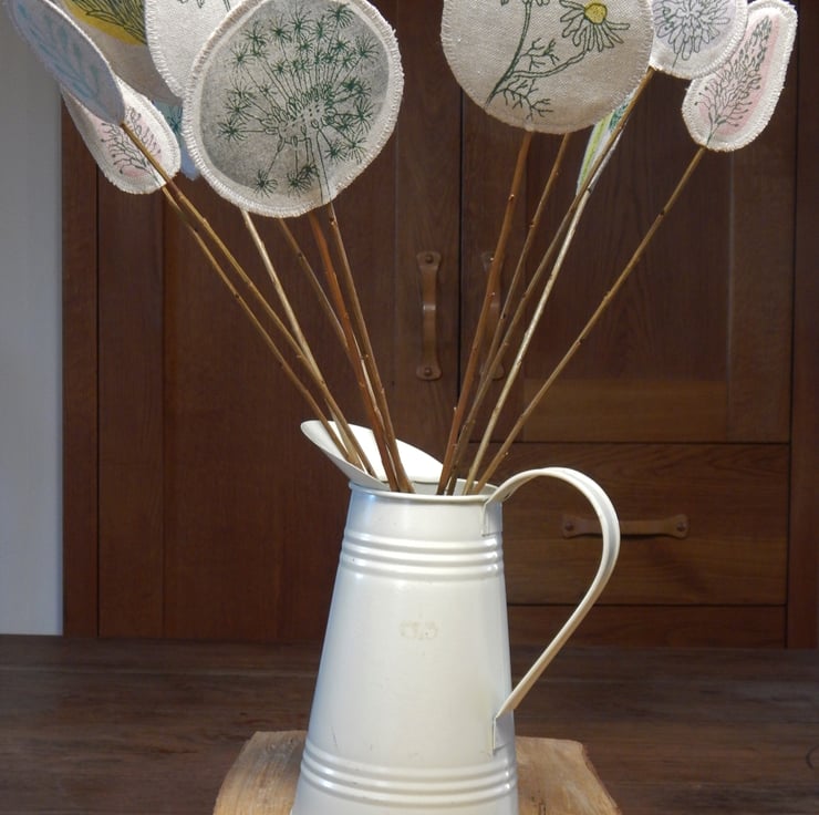 This is a bouquet of 12 fabric on willow creations. Each is double sided with interfacing for stability. They are all have running stitch and then a zig zig stitched finishing to ensure fraying is kept to a minimum. They are then hand glued onto willow which measures about 40 cm in length. The flowers are screen printed with a simple lino print of colour on each.
