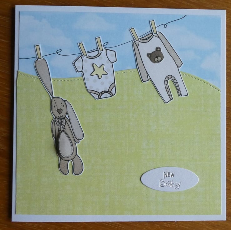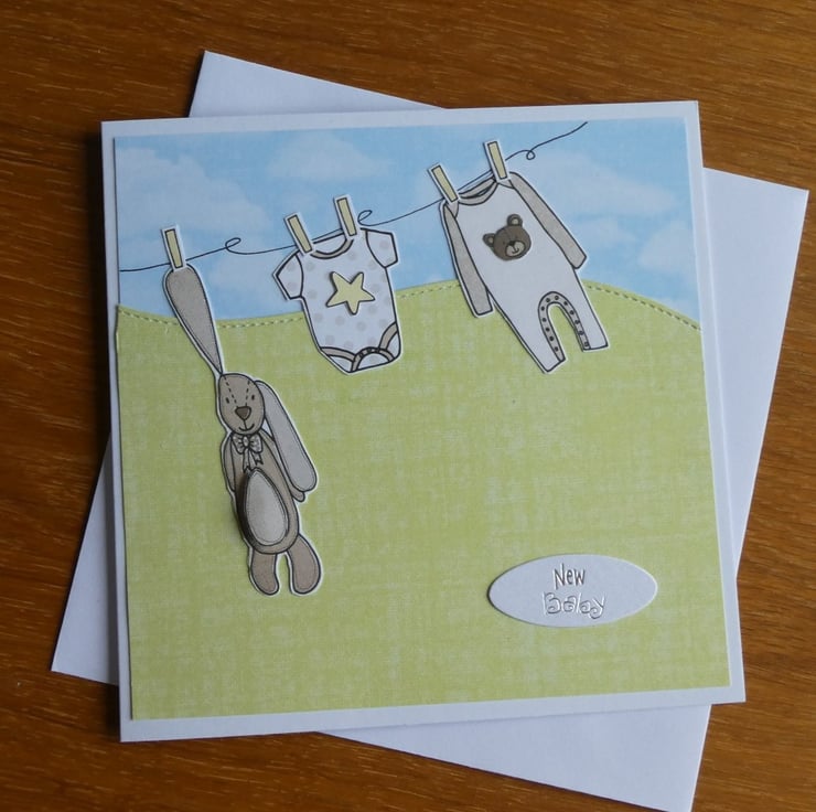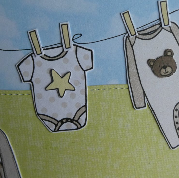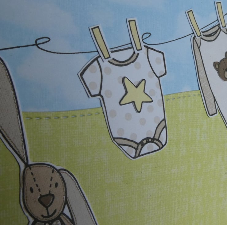 A washing line has been hand drawn onto the background with a brown bunny, a baby vest with a yellow star and a babygrow with a teddy bear face decoupaged to look as if they are hanging from the line by pegs.