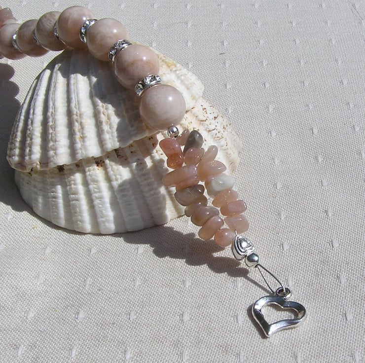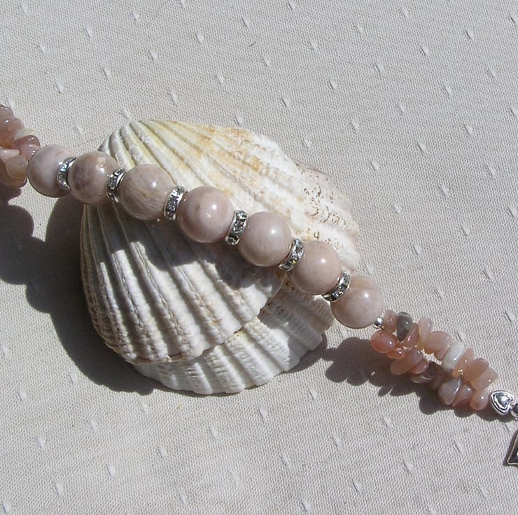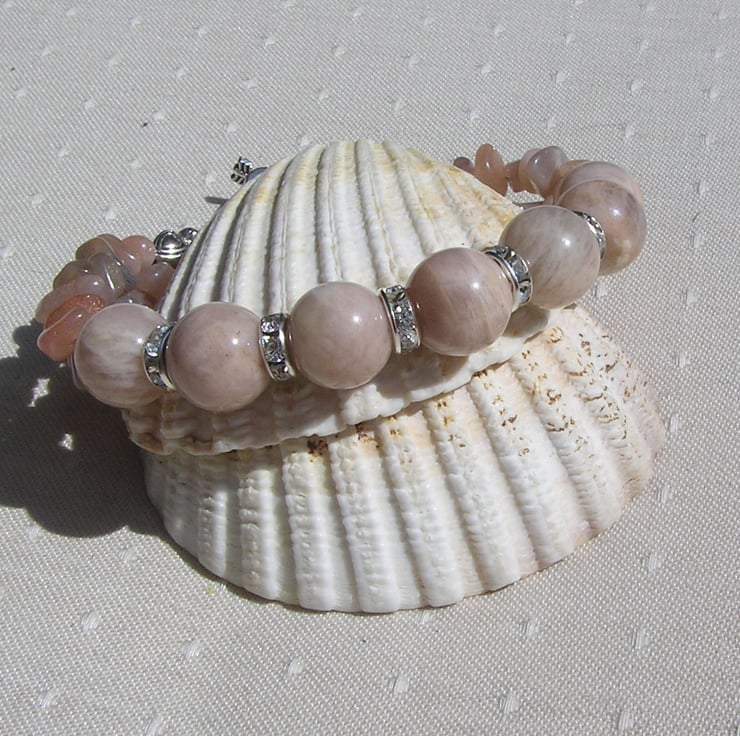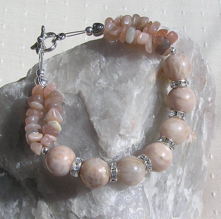 This Stunning Bracelet is made wholly from Peachy Sunstone - Chunky Round Beads alternated with Glistening Crystal studded spacers which then flow into double-stranded Sunstone Gem chips - a warm, soothing mix that will look stunning either worn casually or with something more Elegant for a Special Evening out
