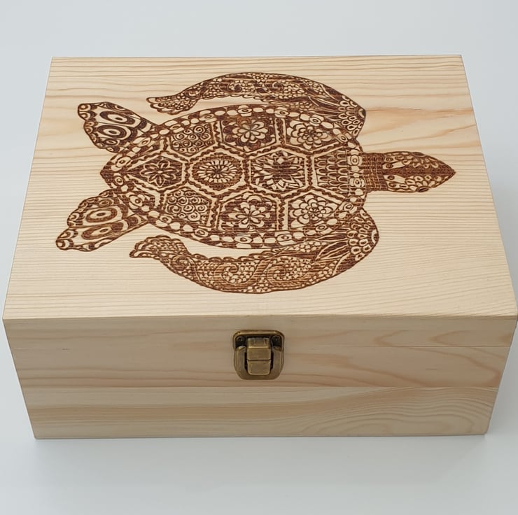 Gorgeous turtle design wooden pine box with a metal clasp. The turtle has been lovingly handburnt on the lid using the art of pyrography. The outside of the box has been given several layers of satin wood varnish for protection. The inside of the box has been lined with modern blue and green wave design decorative card for added character.