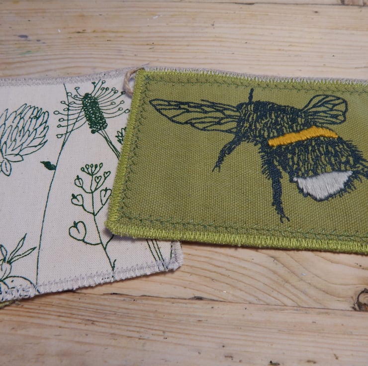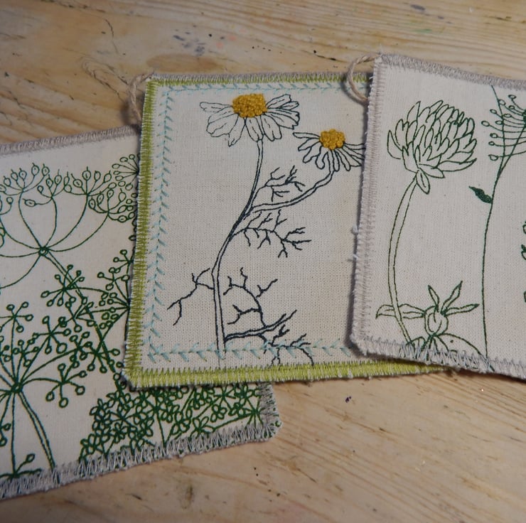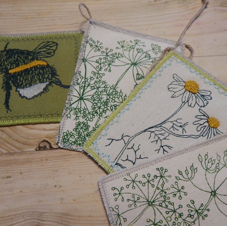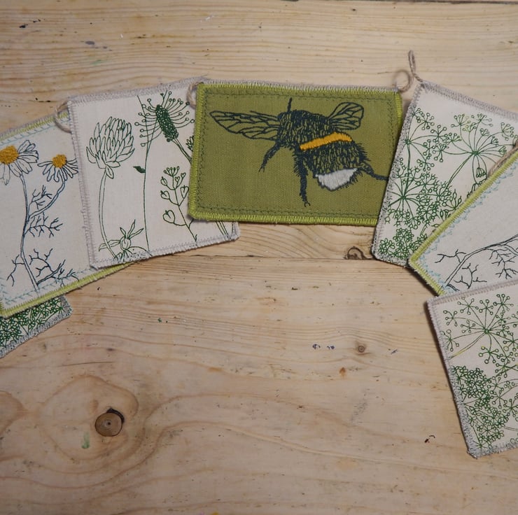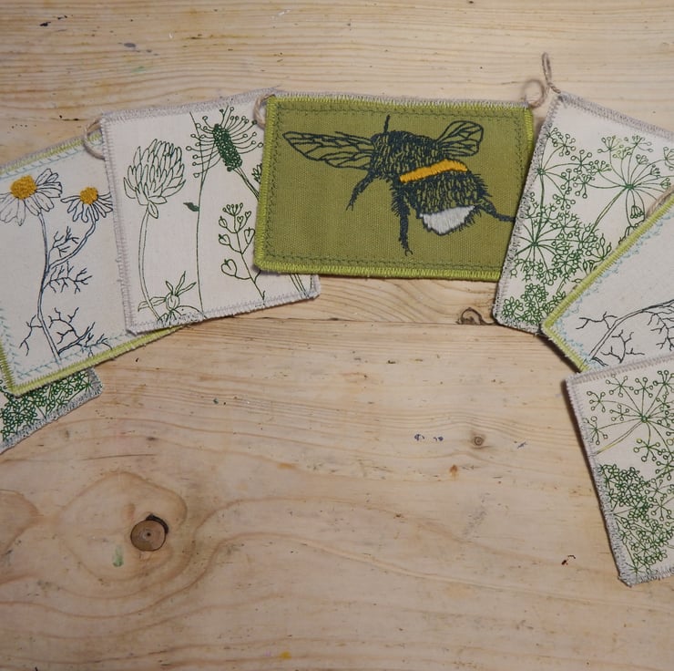 There are 7 panels that have my screen print designs on them. There is a central bee, with hand embroidered bands. There are green screen printed hedgerow flowers and cow parsley, 2 panels have daisies on them with hand embroidered yellow centres. There are 3 inches between each of the panels.