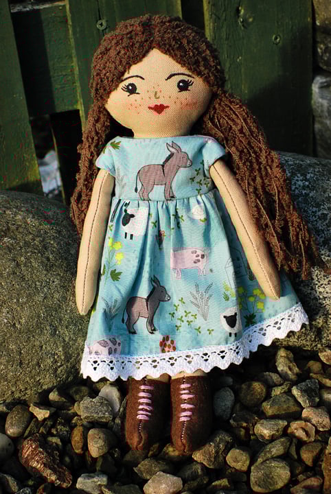 Facial features have been lovingly hand painted with nontoxic fabric paint. Her hair is made out of soft wool. Her arms are button joined.