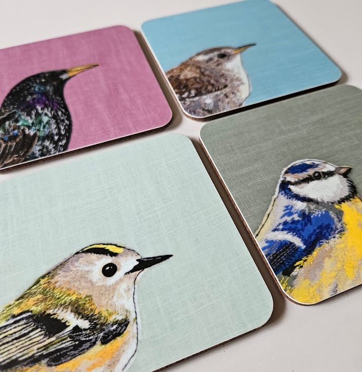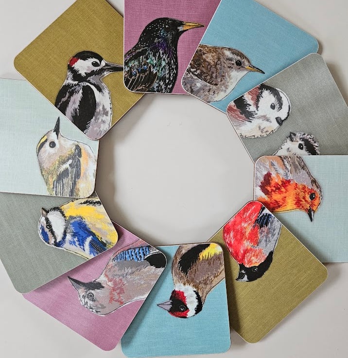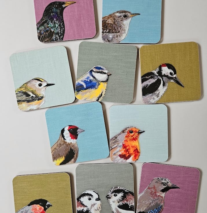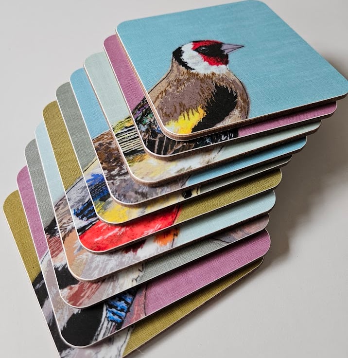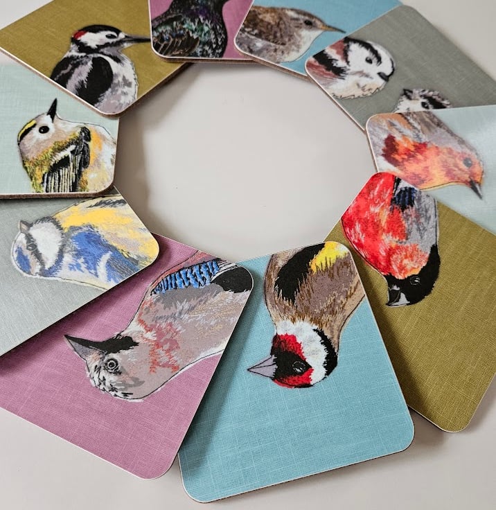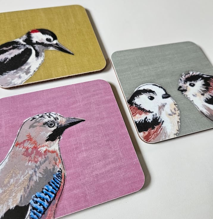 My designs are inspired by British wildlife. I create them using a combination of appliqué and freehand machine embroidery. The designs are then scanned and digitally printed on coasters and greetings cards, and are all listed on my Folksy shop.