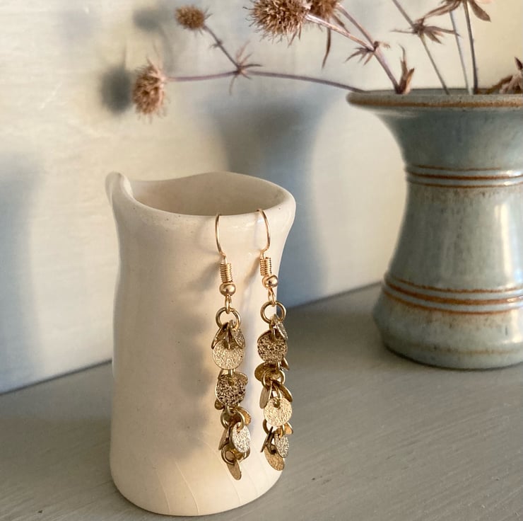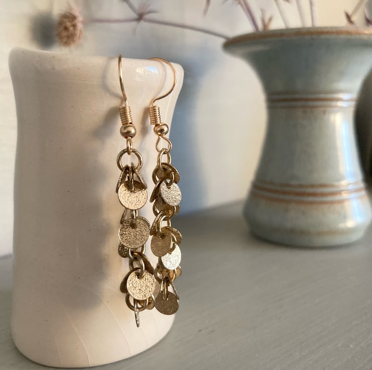 Stunning earrings made with unique vintage sparkle disc chain in a warm gold-tone, and gold-plated earring hooks. The earrings are approximately 5.5cm in length including the hook. Perfect for a party or special occasion! Also available in silver and black.