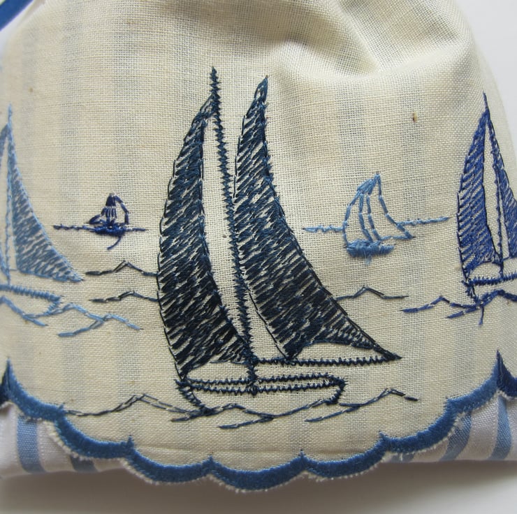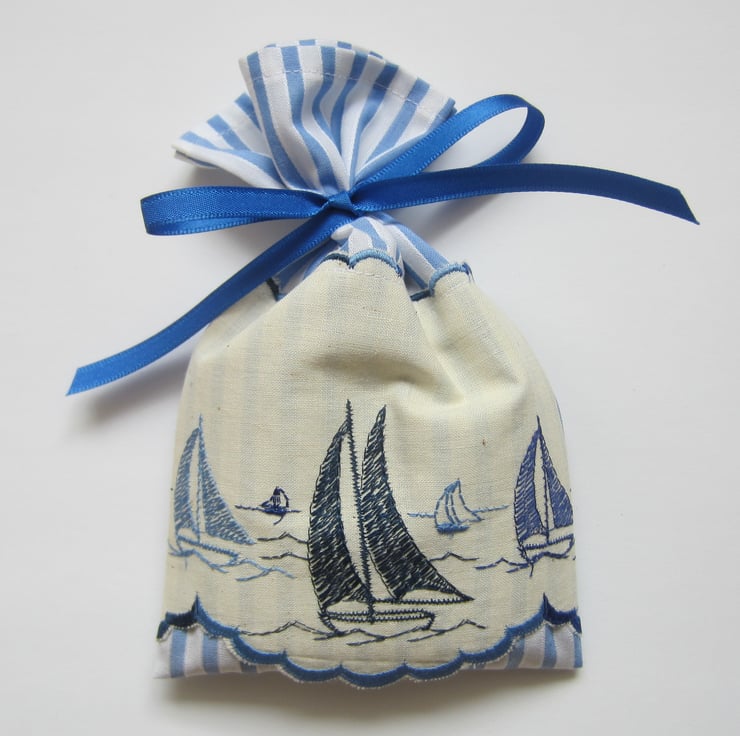 Lavender drawer sachet made from blue and white striped fabric and decorated with a vintage embroidered yachts design trim.