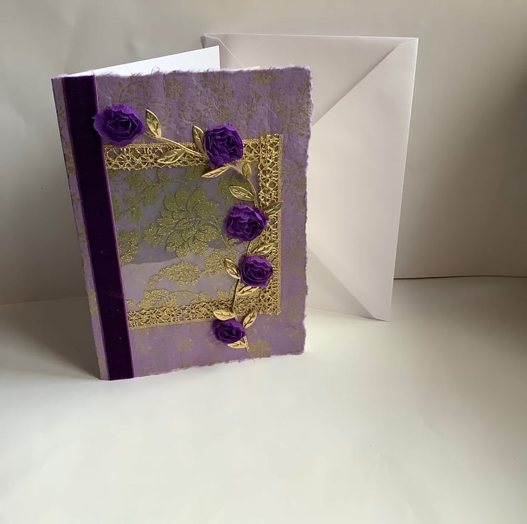 A gold leafed stem winds up the front of the card with 5 purple flowers attached.