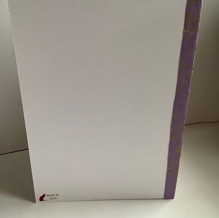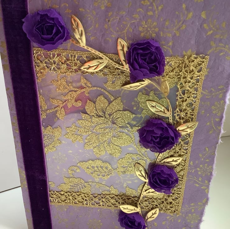 The front of the card is made up a purply lilac and gold paper with a centre piece which is clear with gold. Around 3 sides there is gold lace braid.