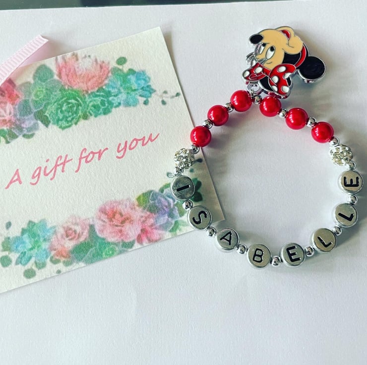 Red and shamballa beaded stretch bracelet with minnie mouse charm