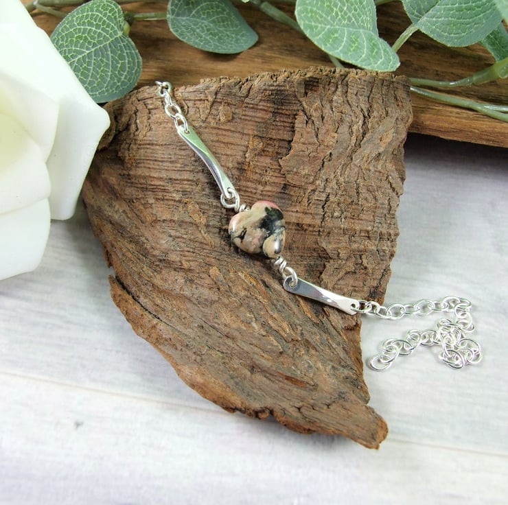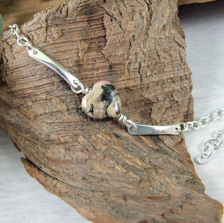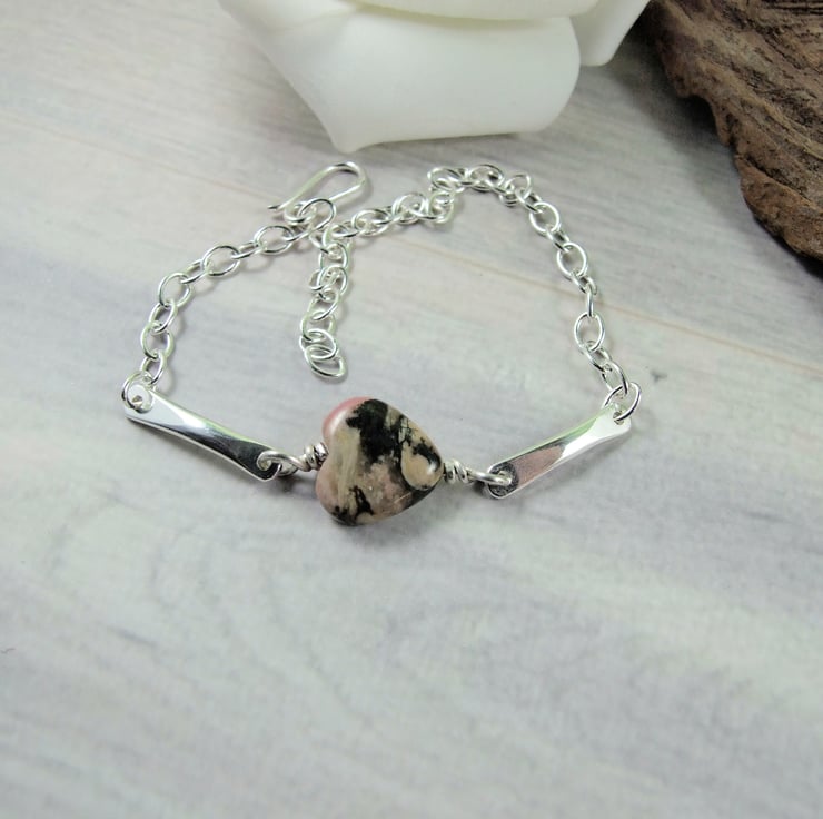 Handcrafted bracelet, the centre stone is a pretty Rhodochrosite heart gemstone bead wire wrapped and fitted to two small silver bars. I have created the bars from 3mm wide oval wire hammered at each end and rounded smooth with holes drilled and fitted to sterling silver chain with hook style clasp closure.