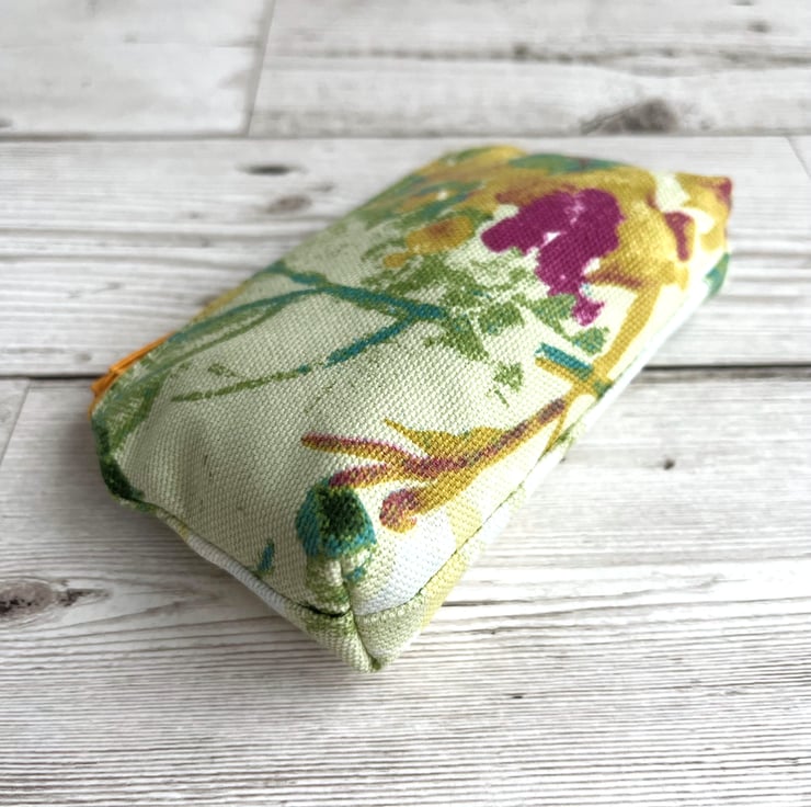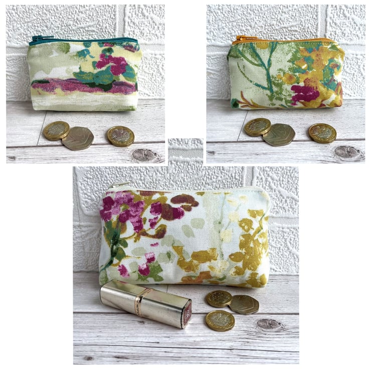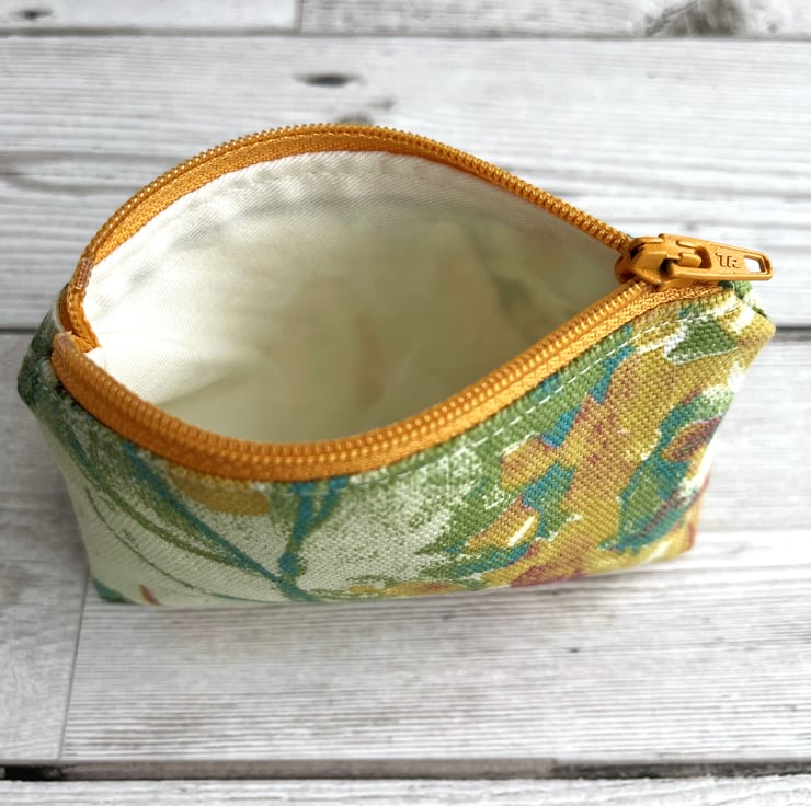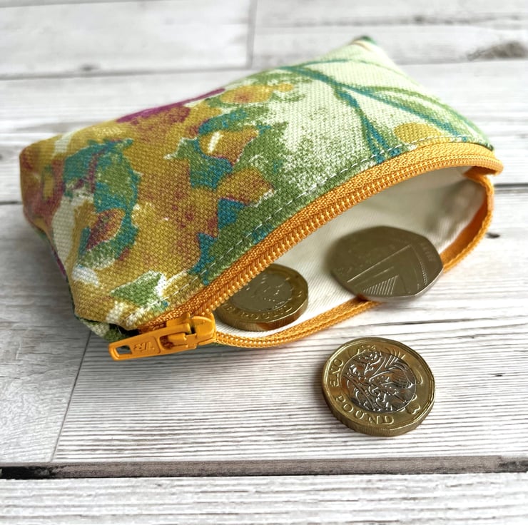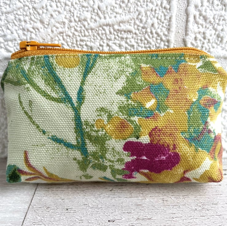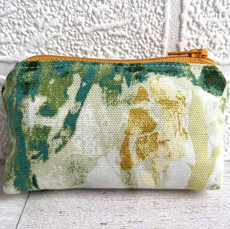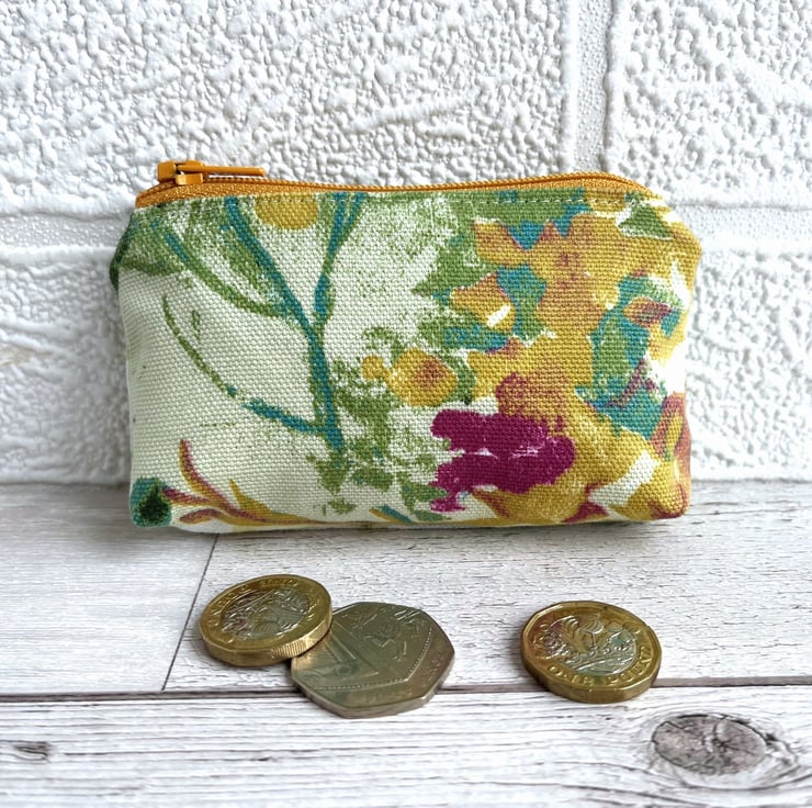 Small coin purse with abstract blossom. This small-sized coin purse is made from a lovely print fabric with a gorgeous abstract pattern. The pattern shows colourful blossom in a style reminiscent of an abstract painting, and features shades of golden yellow, turquoise, green and dark pink on a cream background. The coin purse has a matching golden yellow zip fastening and is lined with cream fabric. The base of the purse is boxed to give more space inside.