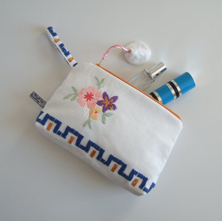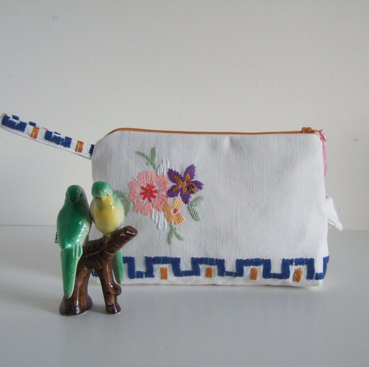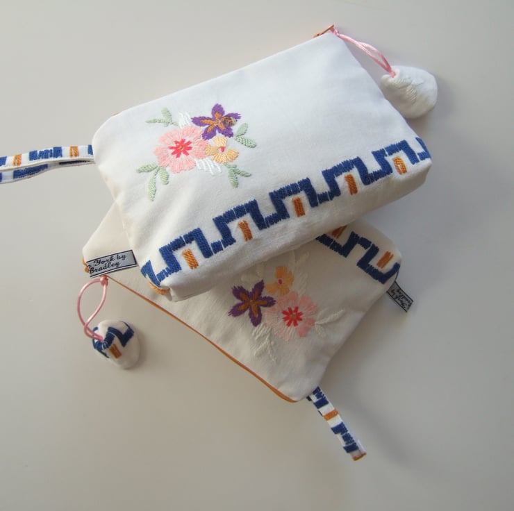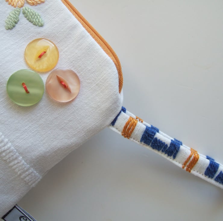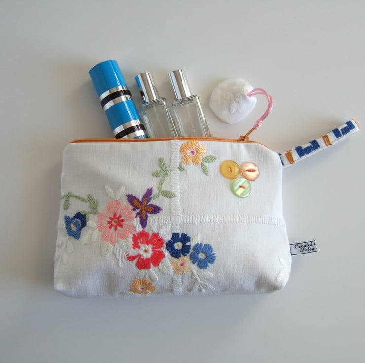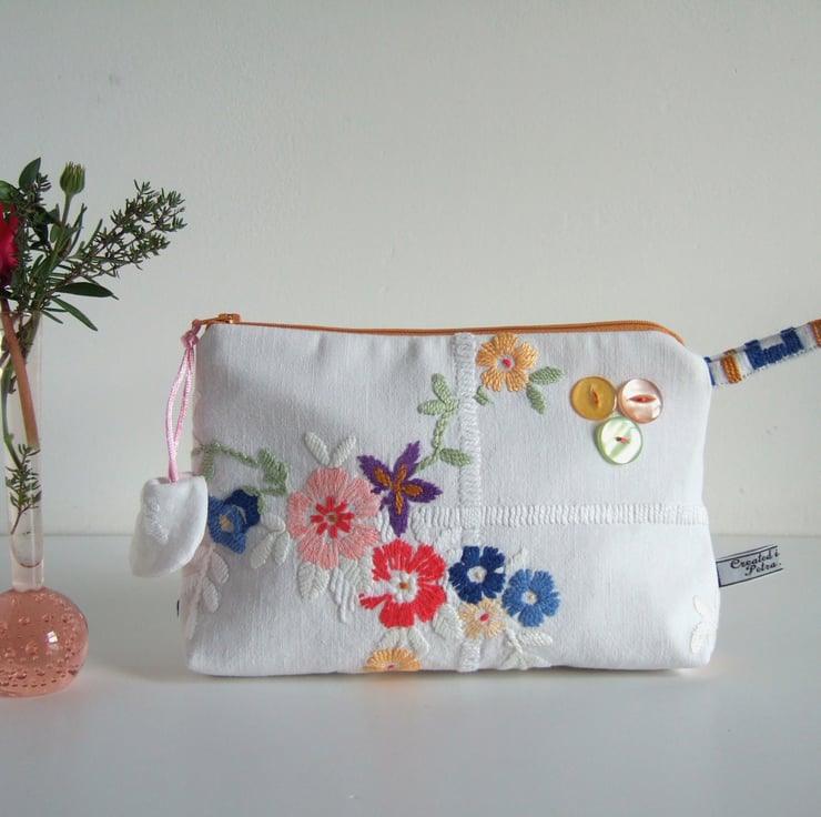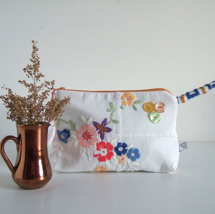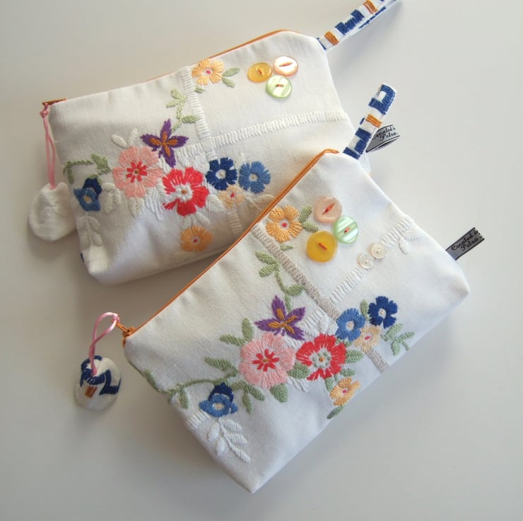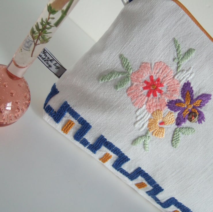 This pretty bag is an end of line, and so it has gone into my Seconds Sunday to create space for new things! A pretty little storage bag, perfect for make up, travel size toiletries, or whatever you fancy! Made from a section of a lovely old tablecloth which had seen better days, it shows its history with a softly faded, washed out feel. The front has a bunch of handsewn Springtime flowers and a clutch of vintage buttons, whilst the back has a small sprig of flowers from another section of this great old table linen. It would make a sweet present for a bride to be, as a surprise for a best friend, or as a Mothers day gift.