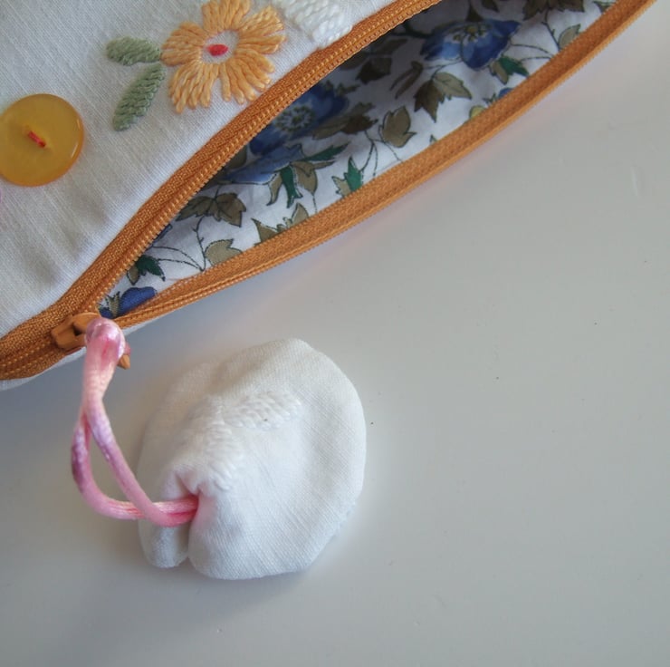 There is a gold 22 cm zip with a white flower head pull, and it is lined in a floral vintage cotton.