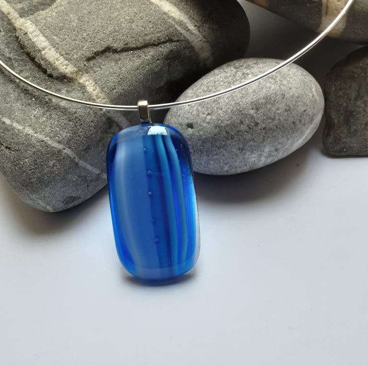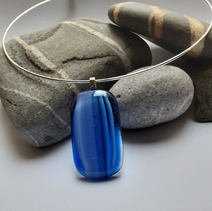 A beautifully simple pendant on a 18" silver plated neckwire. This features a hook clasp and threaded ball stopper which can be unscrewed to remove the pendant if required. The fused glass pendant is handmade by me using a piece of transparent blue Bullseye glass as a background with an overlay of blue toned stripes.