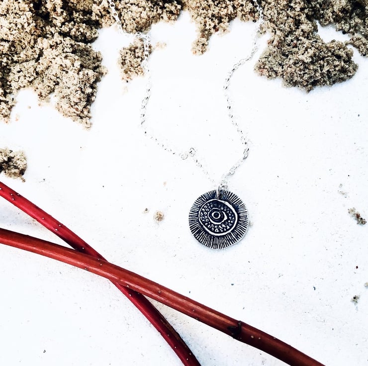 This is a sweet pendant featuring a sunshine design that is actually pressed into the Silver. We use an oxidising solution to darken the pattern and really make it 'Pop!'