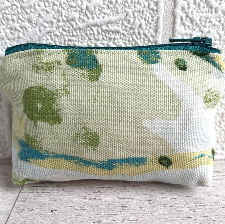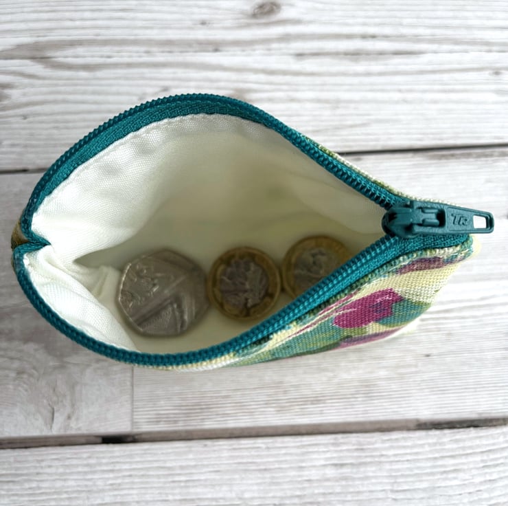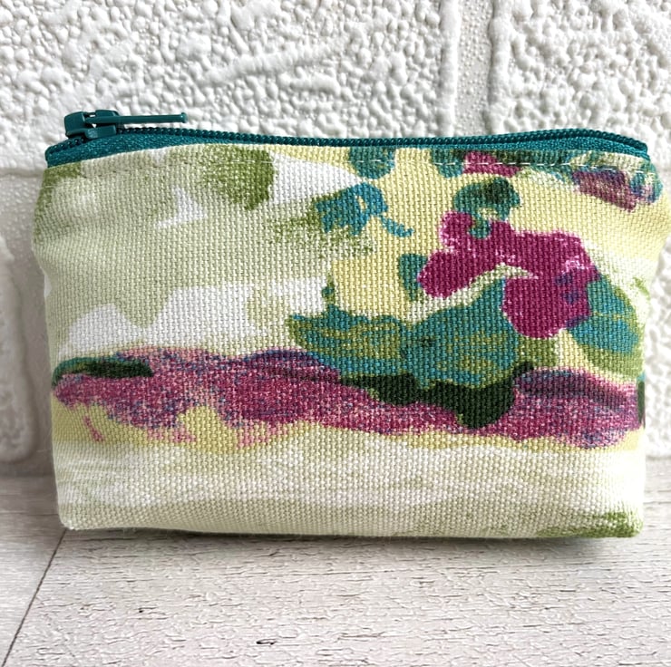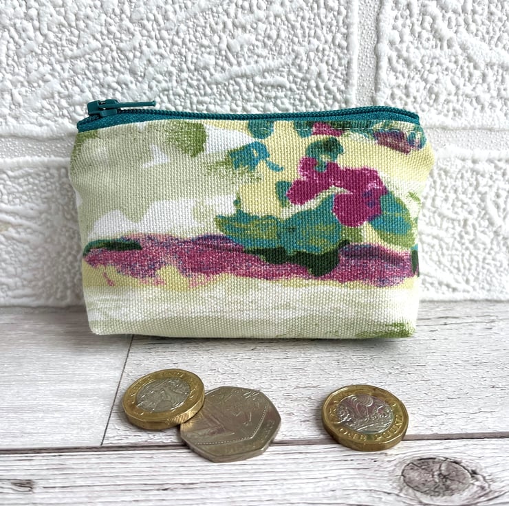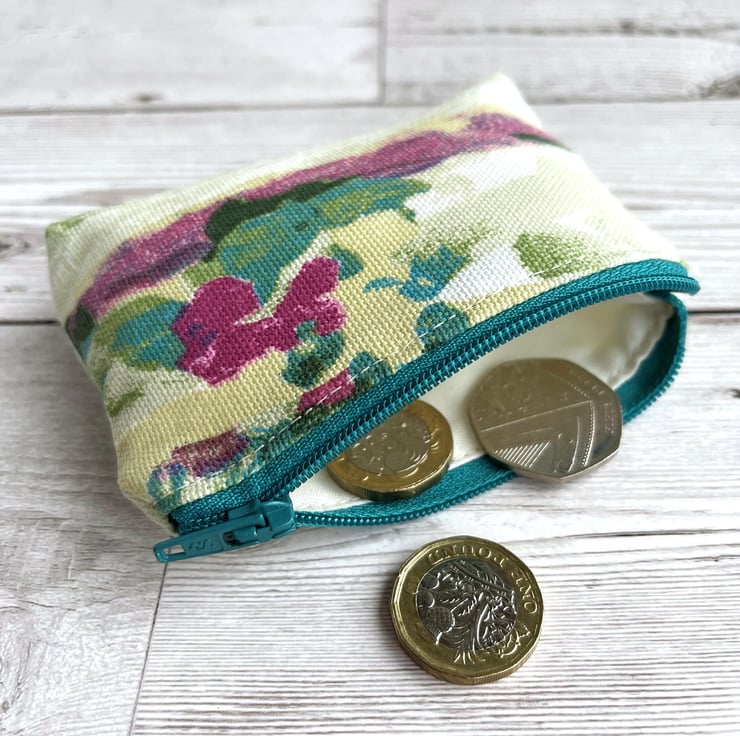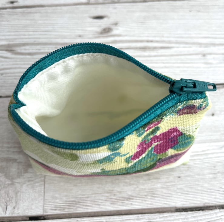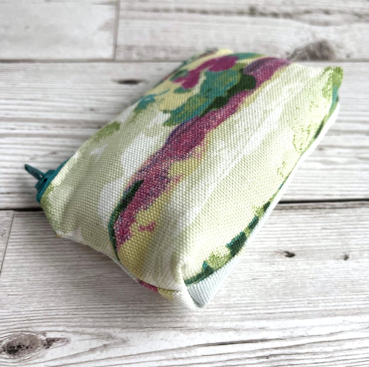Small coin purse with abstract blossom pattern. This delightful little coin purse is made from a pretty print fabric with an abstract pattern. The pattern has the appearance of colourful blossom in a style reminiscent of an abstract painting. The colours are vibrant, and include shades of turquoise, green, dark pink and pale yellow on a cream background. The coin purse has a matching turquoise zip, and is lined with cream fabric. The base of the purse is squared off to give more space inside.
