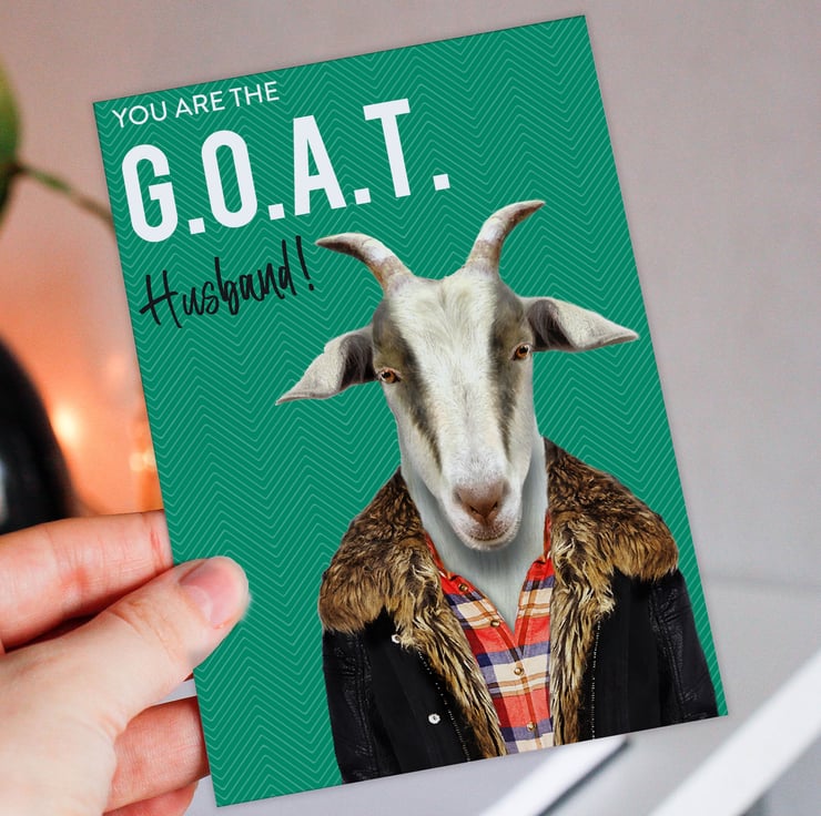 Goat in clothes Valentine's Day card for husband: Greatest of All Time (G.O.A.T) Husband (Animalyser) (Size A6/A5/A4/Square 6x6")