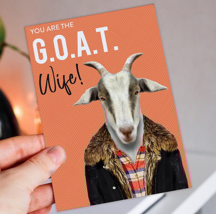 Goat in clothes anniversary card for wife: Greatest of All Time (G.O.A.T) Wife (Animalyser) (Size A6/A5/A4/Square 6x6")