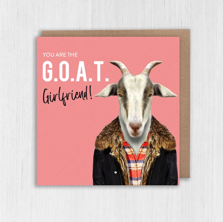 Goat in clothes birthday card for girlfriend: Greatest of All Time (G.O.A.T) Girlfriend (Animalyser) (Size A6/A5/A4/Square 6x6")